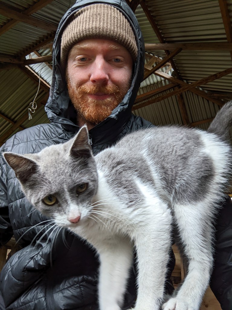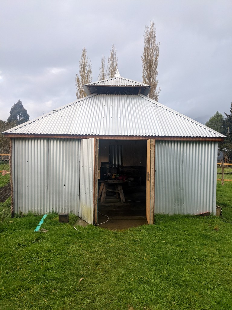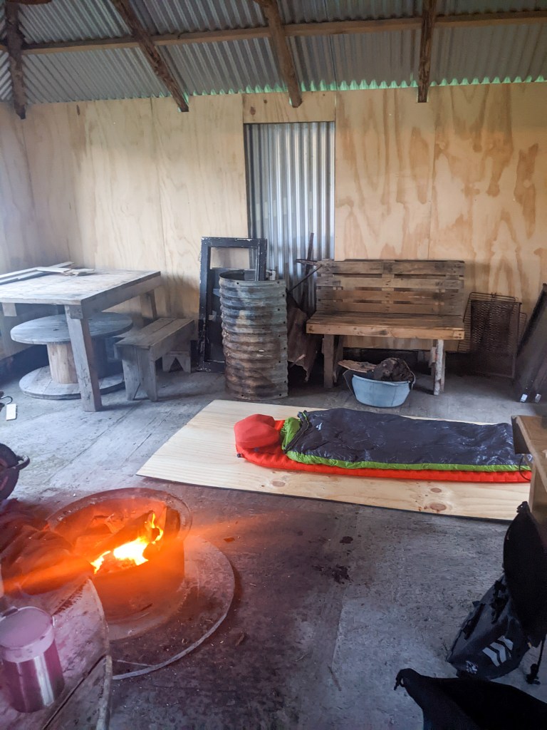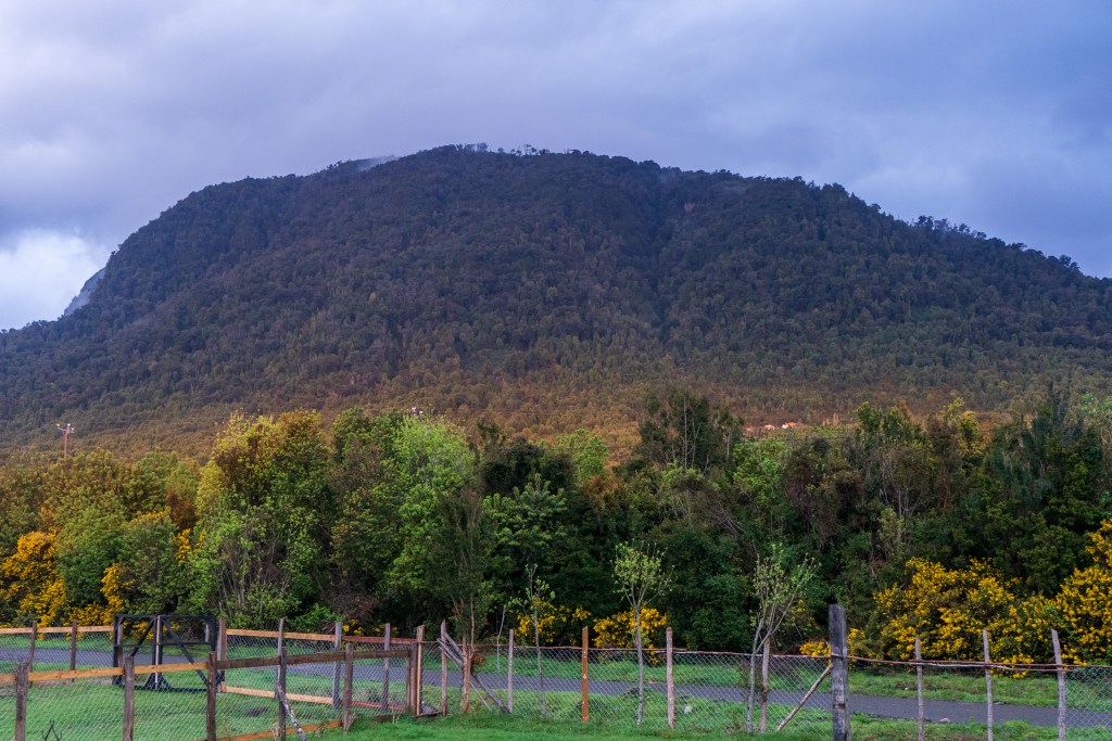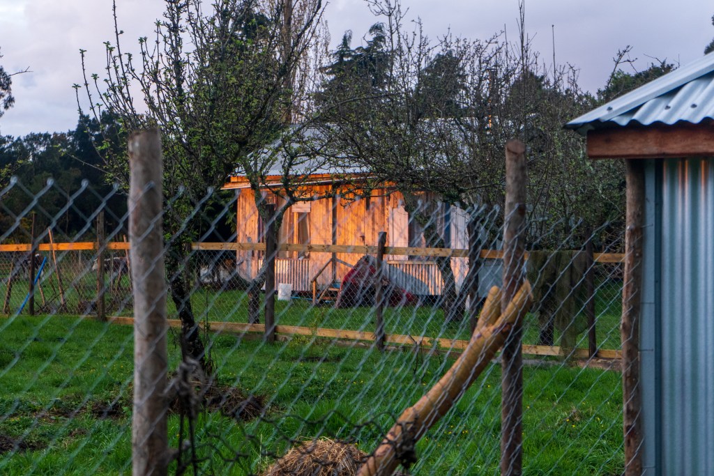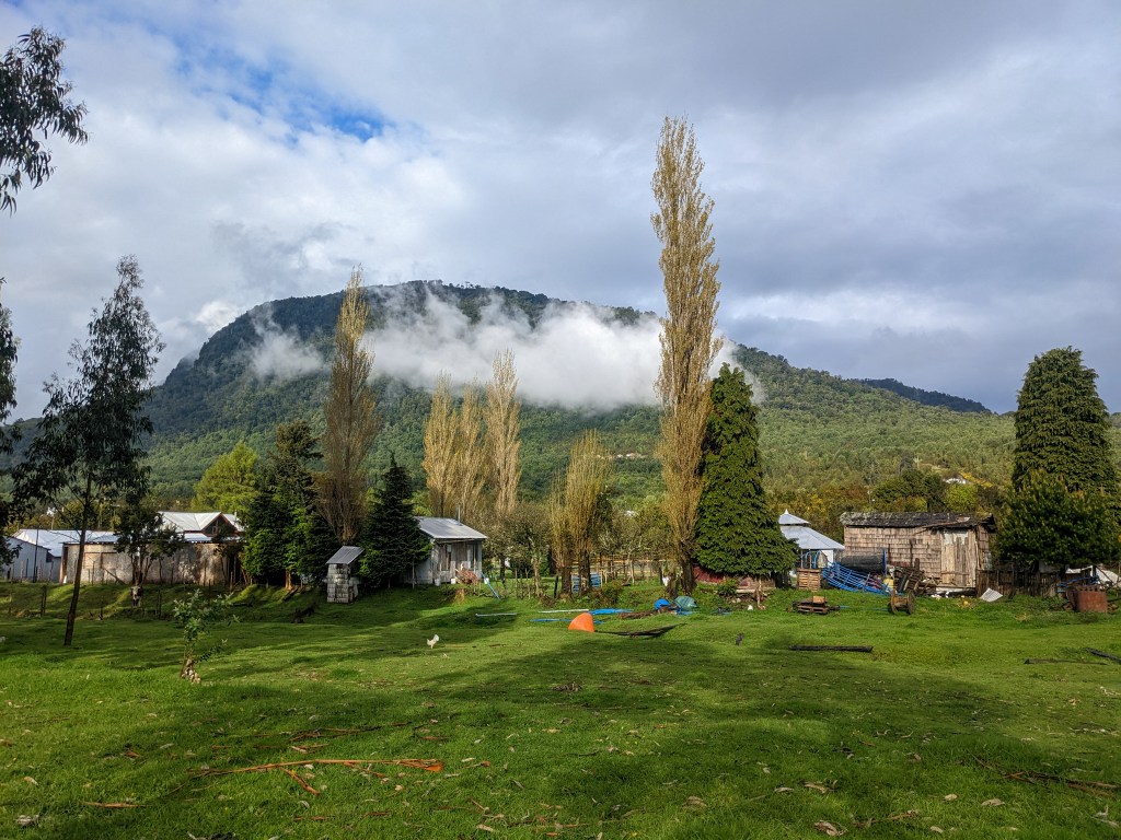 I stayed in a newly built outhouse with a fire-pit in the middle and a sectioned roof to let the smoke out. The owner of the site, a tall friendly man named Jorge, welcomed me in and offered me the dry space and a warm shower. I was grateful to not have to set up the tent this evening, The rain had let off some but it still came through over night. In a brief but glorious window of sun in the evening I took a walk out into the field and then cooked up some rice and tuna on my stove. I set up my sleeping mat on a sheet of plywood by the fire, hoping my stuff would be dry by the morning in time for another wet days ride to Hornopirén and the first of the longer ferries into the fjords.