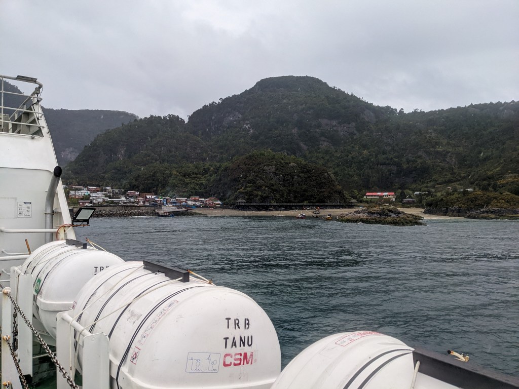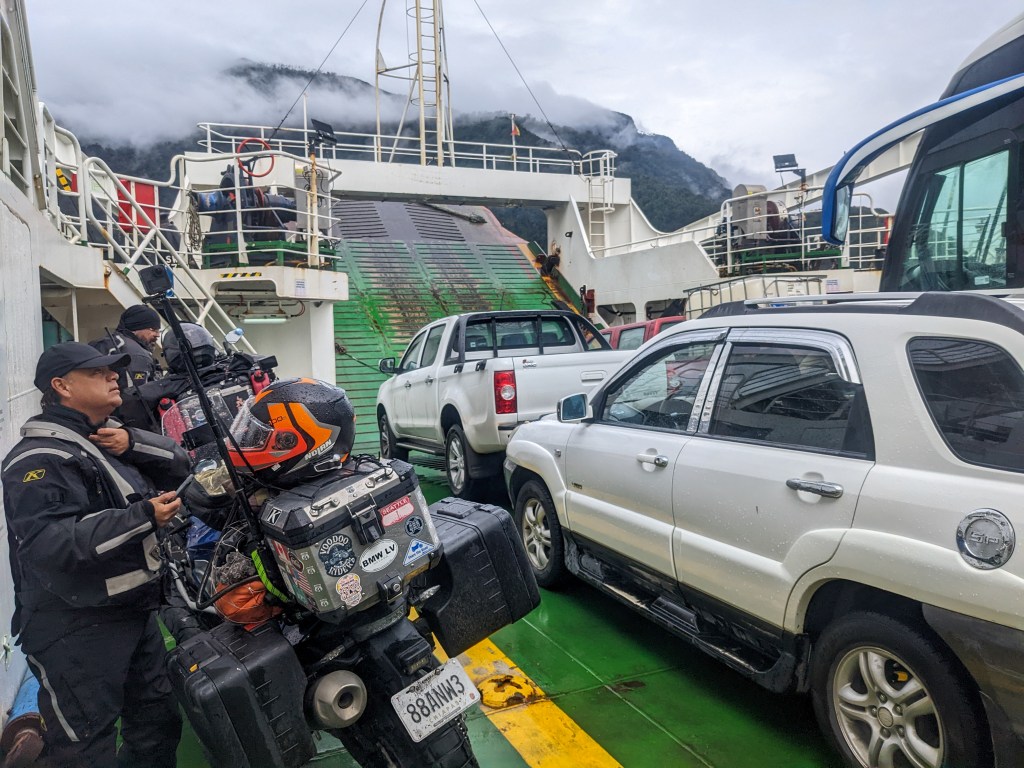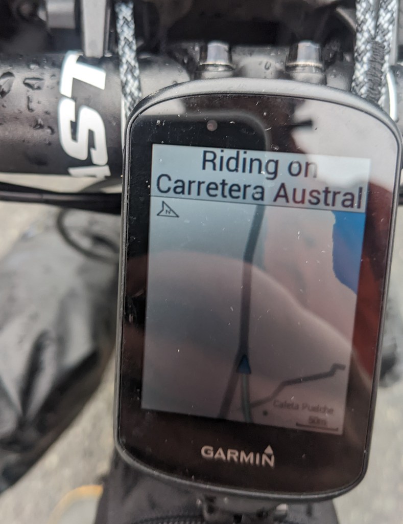 The last 15km before the boat were being counted. I’d stopped for warm empanadas at a food truck a while but the relentless downpour had seeped through everything. After some more ups and downs, surface water streams washing their way across the corners I spotted a ferry loading cars in the distance. Down the cliff road into Punta La Arena and straight onto the slipway, I took a break out of the wind and wet for the short ride over the channel.