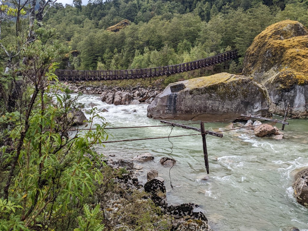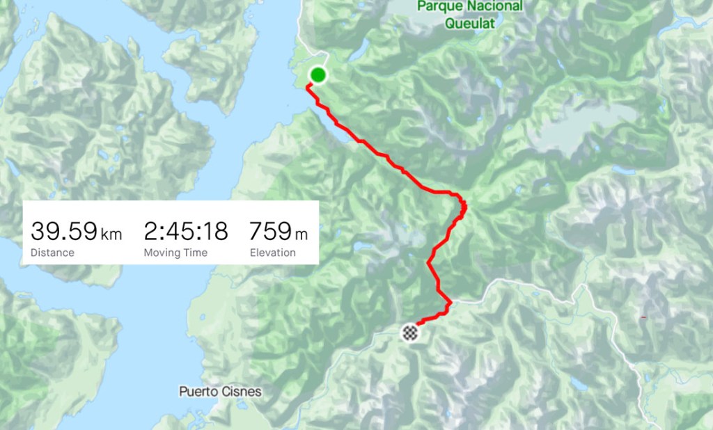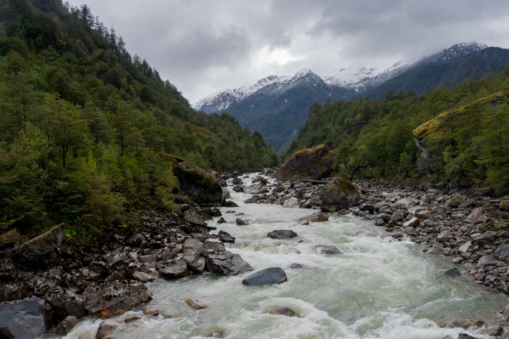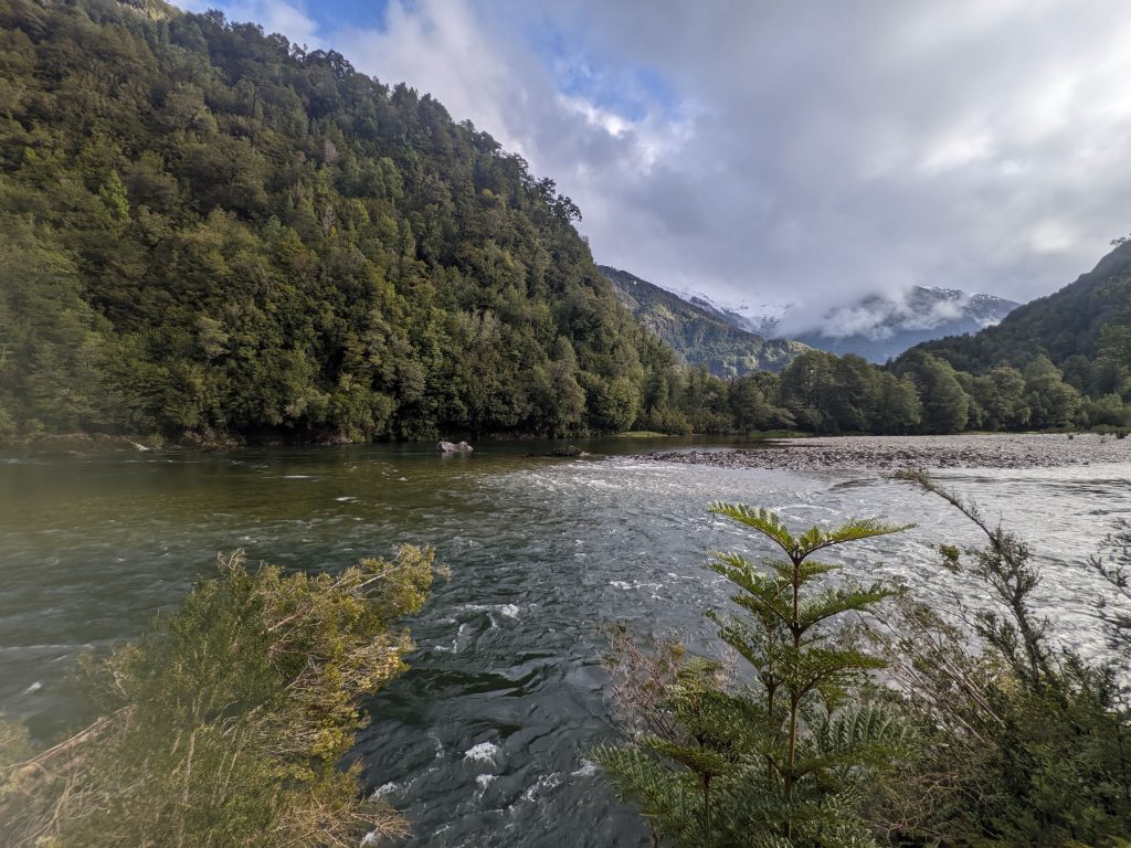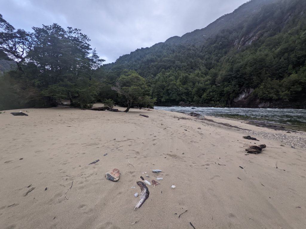 The next 130km along the Careterra looked particularly remote so I played it safe and headed towards Puerto Cisnes where I could restock on food. At this rate I would still be riding in the dark by the time I got there, I wasn’t keen on the idea as I was already soaked-through and cold. Following the cliffs down the valley I spotted a turn off that went down to the bank of the Río Cisnes. The clouds had lifted temporarily and I was greeted with sandy beach in the sun, cold green water flowing by and round a bend. A kingfisher flew by, wings almost touching the surface. There were patches of bushes and trees giving cover to soft ground, hidden from the road I set up camp. I went to explore the beach but the freezing rain came back so I set in for the night, put on layers of dry clothes and cooked a huge pot of lentils. Before it was fully dark I had lay down and fallen asleep, straight through for eleven hours.