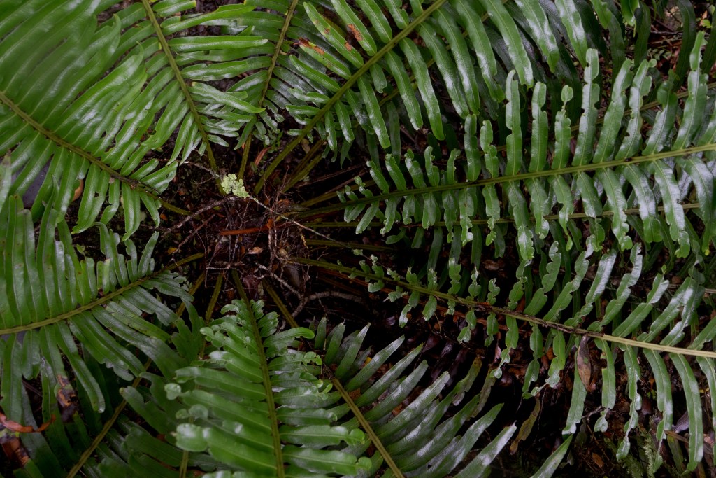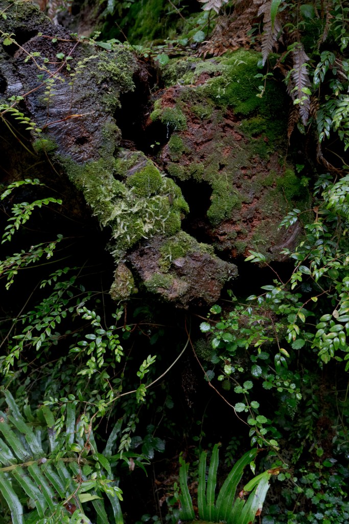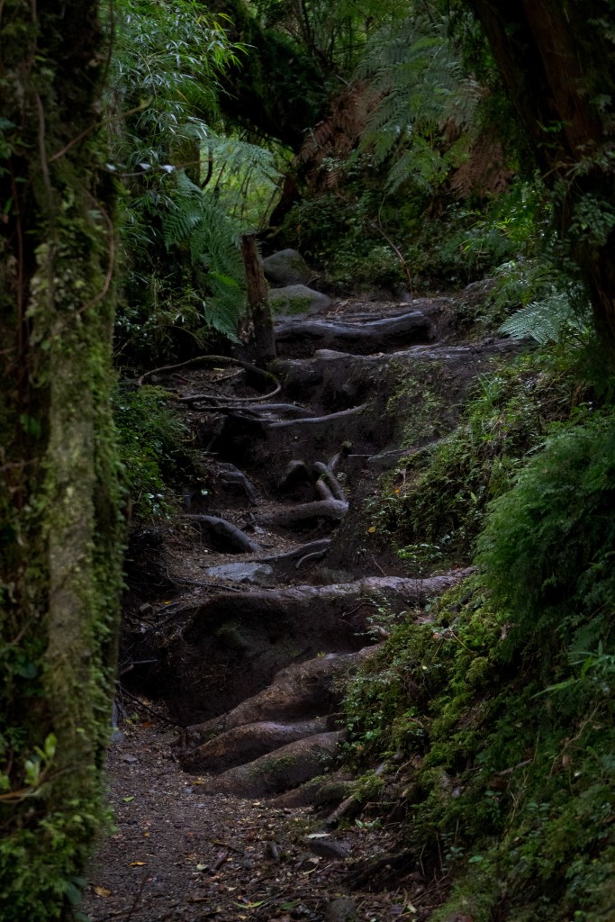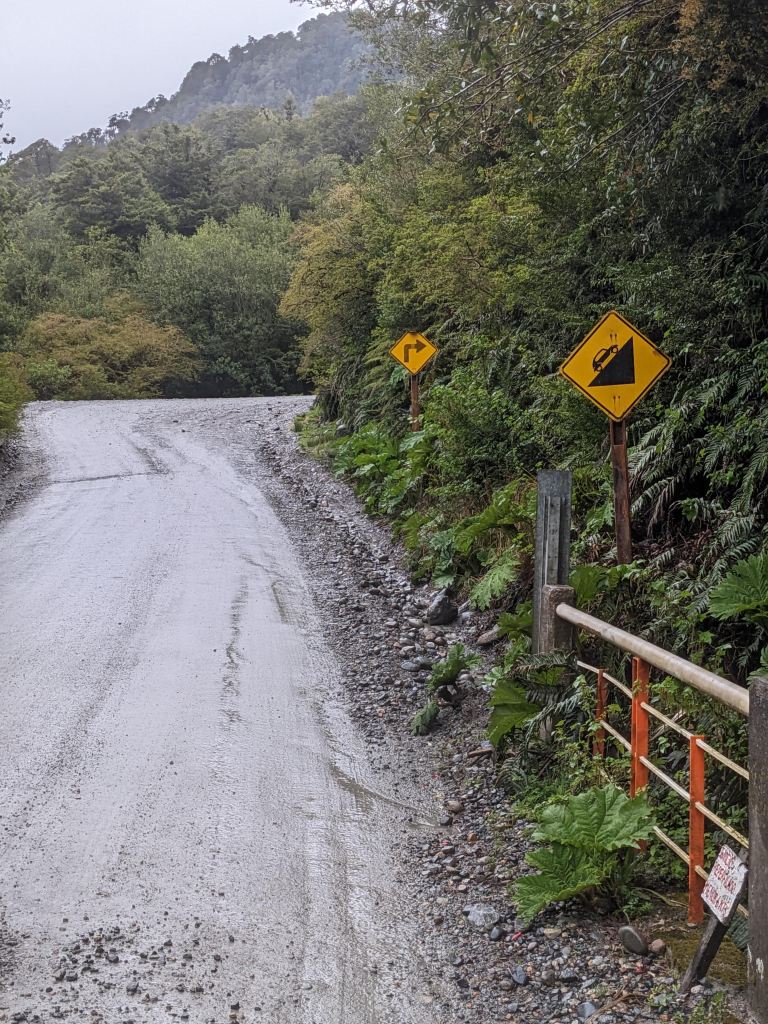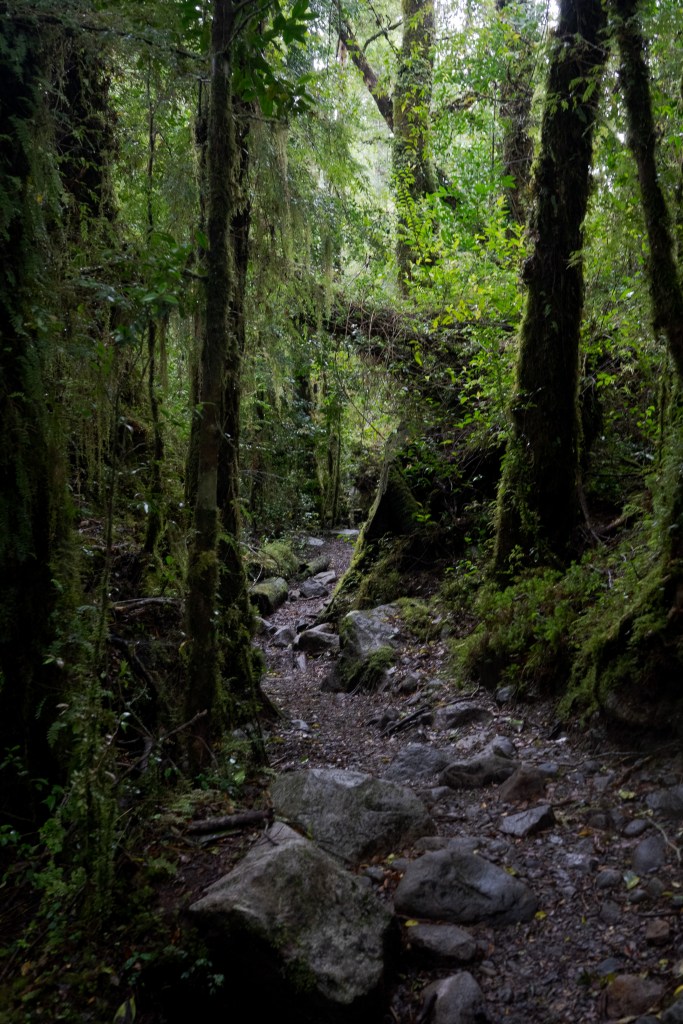 Once over a wooden suspension bridge above the rapids, crashing down from the glacier’s meltwater, I took the windy climb for 3.5km up to the viewpoint. The trail was narrow and overgrown, still the temperate rain forest felt like tropical jungle, just colder. Thick roots and creepers mix with ferns and mosses and streams spill down rock faces into the path, the air thick with humidity.