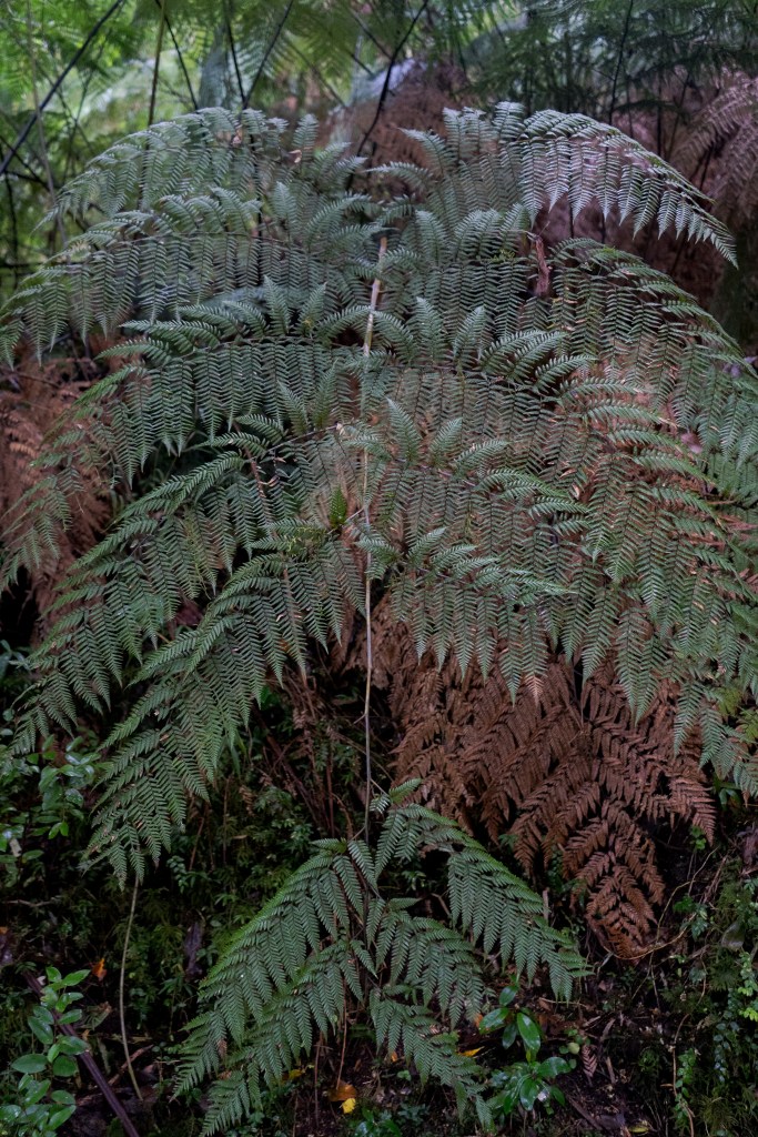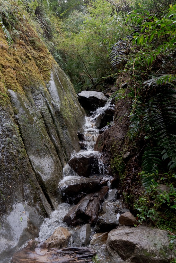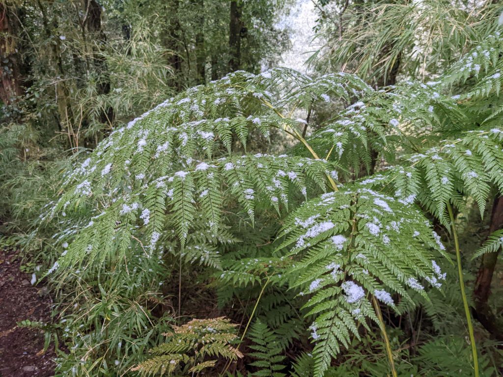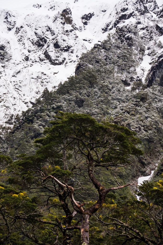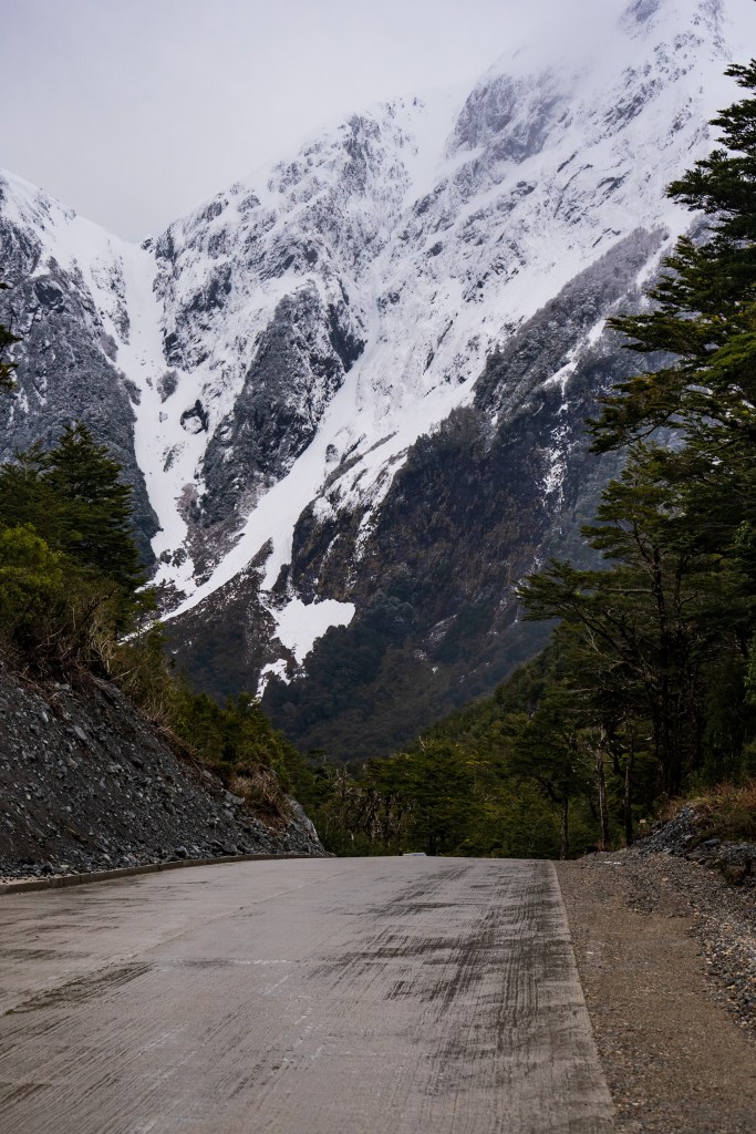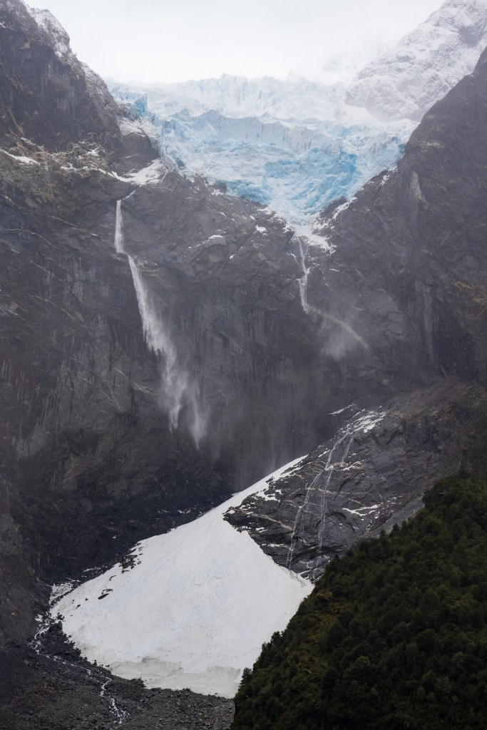I reached the viewpoint just in time, within 10 minutes a cloud had swept in up the valley and obscured the glacier, still a kilometre away in the distance. The Ventisquero Glacier hangs at the top of a vertical cliff in a deep V between peaks. From the overhang spill two thin waterfalls that whip and fray in the wind. By the time the water reaches the bottom of the cliff it has turned to snow and lands in a drift, mirroring the triangle of ice above. I had time to take a few photos and eat some of yesterday’s leftovers at the viewpoint before the cloud came in and started dropping huge snowflakes into the forest. The walk down was surreal with flurries coming through the canopy and the quietness that snowfall brings.