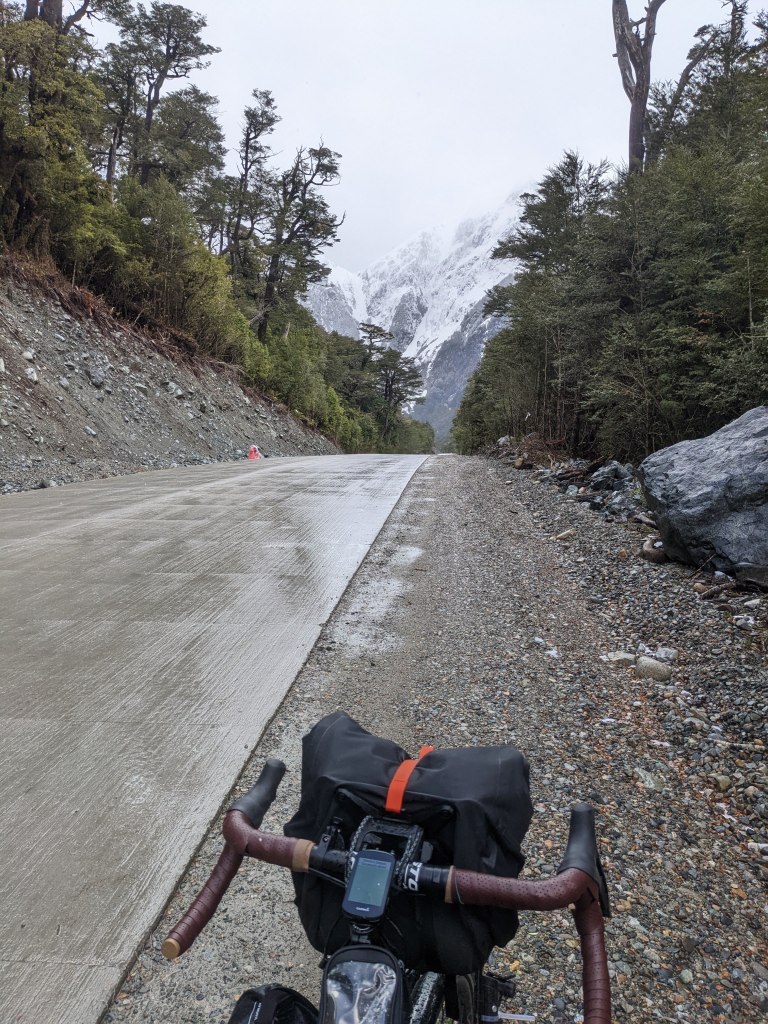 It was a big climb, about 600m vertical on dirt road with steep corners, but I got into a good rhythm and could rest a little on the straights. On the right-hand turns I had to switch to the opposite side of the road to avoid the impossible corkscrew on the inside. Up and up through the rainforest, gaps in the trees gave a view down into the valley where small clouds were trapped. Towards the top I began to pass piles of snow on the side of the road and soon more was coming form the sky. Not the big soft flakes from this morning but hard ice pellets that collected in the contours of my bags. I was producing enough body-heat from the climb to not feel the cold, even my gloveless hands were comfortable as I pedalled into the ice. The road widened up and the opposite side became a lane of freshly laid concrete paving, I moved over to that side and picked up some speed as I approached the plateau. Cresting over the top gave a spectacular view of the next mountain over and in a brief moment of clear skies I changed my layers and prepared for a cold descent. I snapped a couple of pics but the batteries were struggling in the cold and the camera shut down. It was getting quite late in the day and I was keen to get back to lower altitude before the temperature dropped any more.