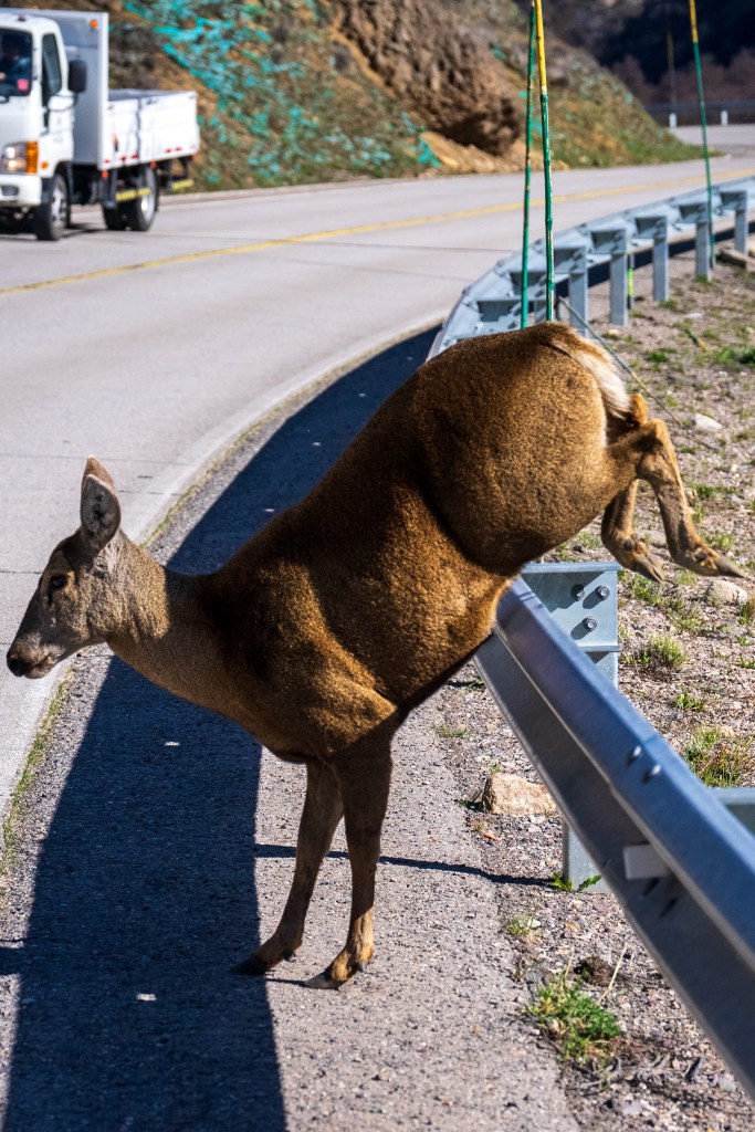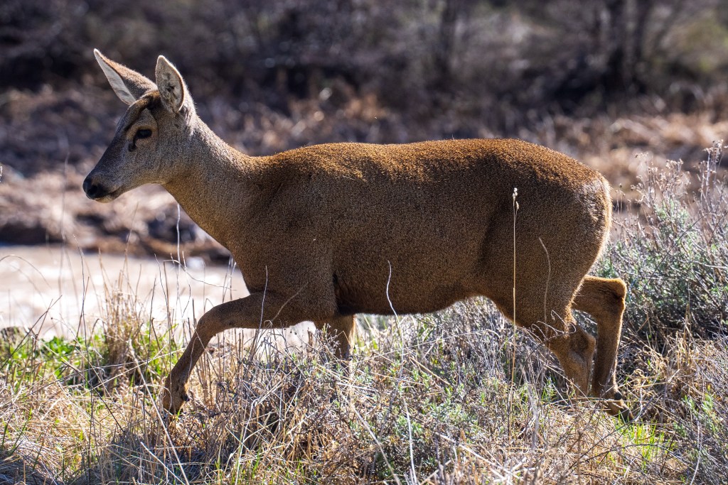 The sky was still clear in the morning which made for a chilly descent from the lagoon. I headed off early, scarf up around my face and not yet warmed up from pedalling, the wind blew any remnants of sleep from my body. As I came round the corner with a steep hillside on my left and a riverbank on my right I spotted three huemul, an endangered species of deer native to the southern andes. Two females and a male were grazing by side of the road and took little notice of me as I got closer. They were completely unafraid and hopped over the barrier ten metres in front of me and carried on up the hillside. I read later that there were only 1500 of them left in the wild.