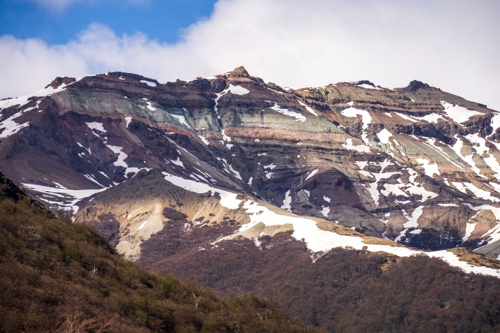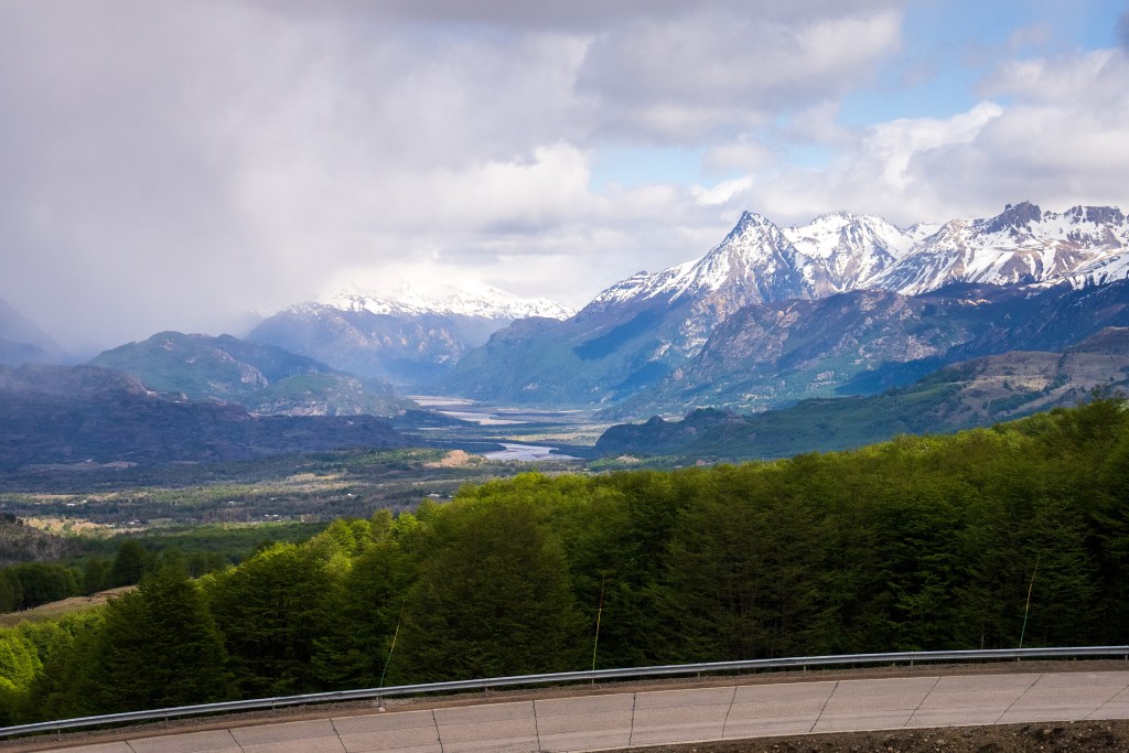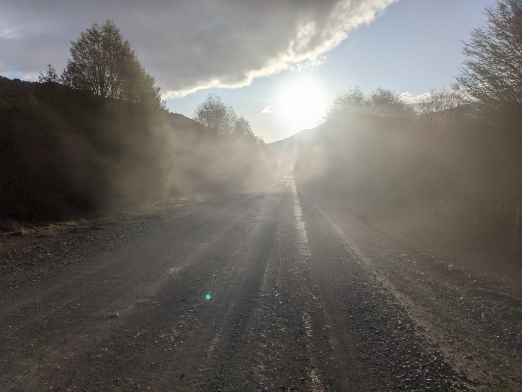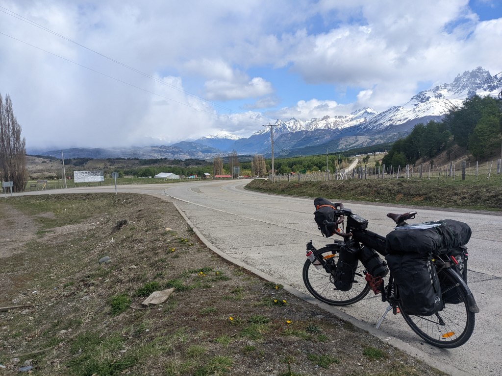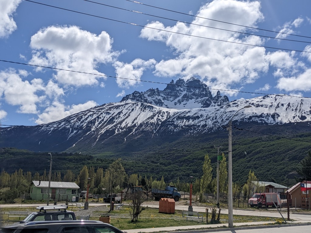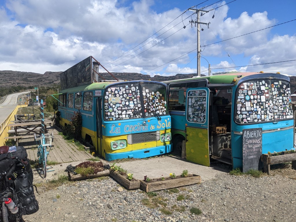 At the end of the pass was a steep drop into Villa Cerro Castillo, a small town at the foot of the towered fortress mountain from which it got its name. Continuing into the frosty headwind I wound down a section of switch-backs that overlooked the valley where sunshine beamed down between white clouds. At the bottom, numb from the wind, I took shelter in an old bus that had been converted into a cafe and thawed myself out by the gas heater. Over the next hour a range of travellers trickled in, amongst them a motorcyclist on his way down from Canada and hitchhikers from Israel and Spain.