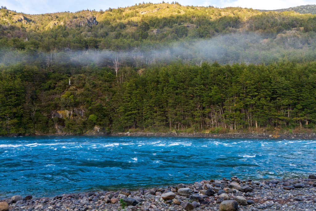 A clear morning on the riverbank. I took my breakfast down to the waters edge and watched the sunlight edging down the forest on the opposite side. The rapids crashed on and on and small clouds of mist shifted shape above the trees until a final dispersion by warmth of the sun.