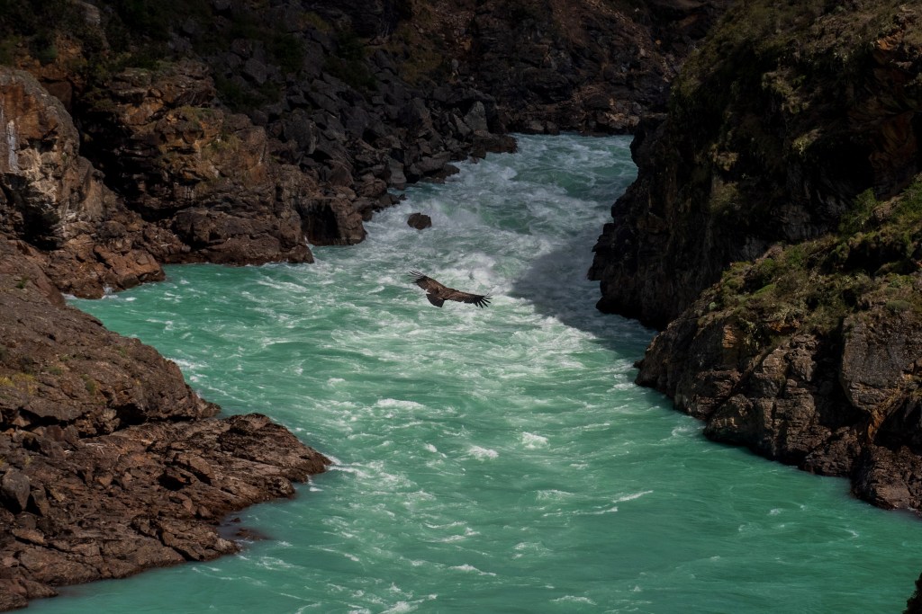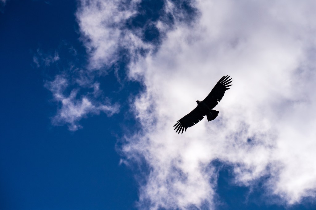 The valley steepened into a canyon and the river’s meander became a faster push through the narrow corridor, violently crashing around corners and dropping down over stepped ledges. Around lunchtime I reach a section where I could see down the canyon ahead, the far side a cliff and the road on the near side cutting along about half-way up. In the distance I spotted two condors flying loops over the river at the same level as the road, occasionally landing on ledges on the cliff side. I sat at a good vantage point and watched their flight, one following the other’s path. I didn’t fully appreciate their size until one of their passes brought them just a few meters away from me. I’m not sure if it was that the mighty condor was after the tortilla wraps I’d just pulled out or that it was just investigating the strange creature sat there in a bright orange jacket. These birds were absolutely huge, I quickly stashed the food back in my pannier. They flew circles over my side of the river for a while, allowing me to catch a few pictures before they disappeared over the ridge.