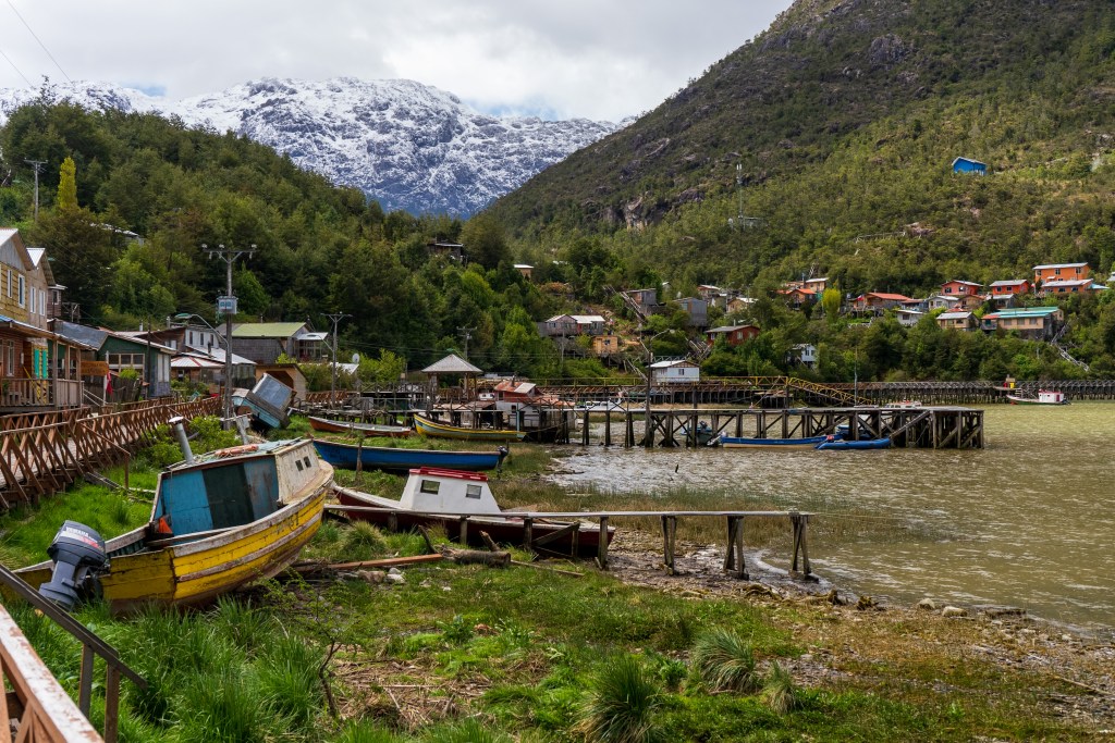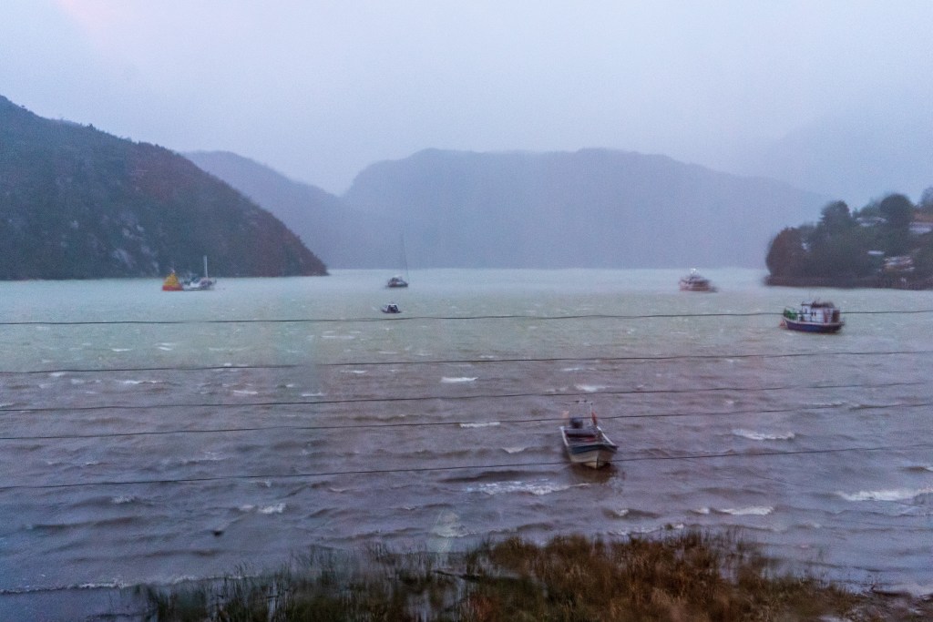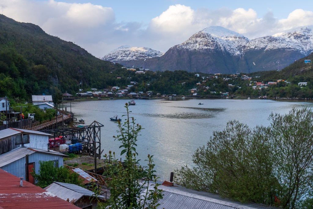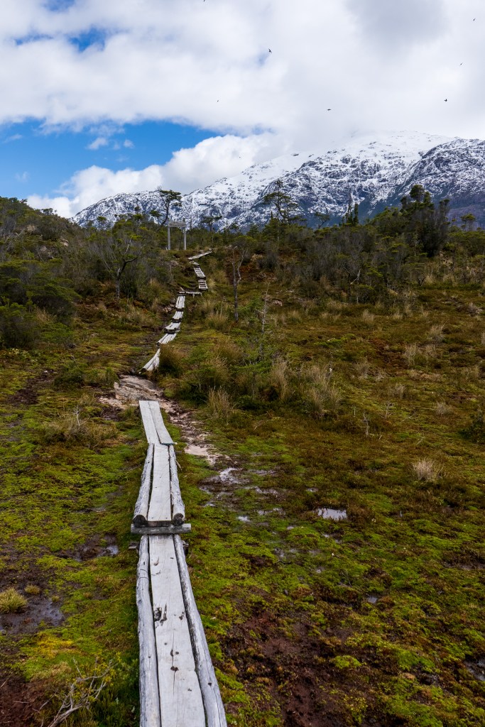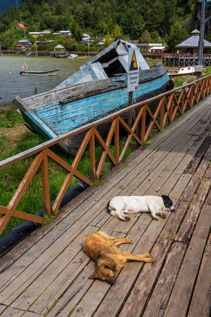 It was all seasons over the next few days, howling winds swept through, battering the small boats, and the snow-line stayed low on the mountains overlooking the cove. The boardwalks remained slick and I witnessed a few people take slips and falls, luckily nobody saw mine. One particularly treacherous path was the trail that looped around the town and connected both ends, parts of it composed of slippy beams, 30cm wide, staked into the the boggy ground. I walked it with a Spanish/Chilean couple who I’d met days before as they hitchhiked on the Careterra, they had got a ride with a German/Chilean pair and were all heading to the trail. I bumped into them sitting in the harbour drinking maté as the sun began to burn through the clouds and so I joined them walking towards the trail-head. Out towards the even quieter end of town piles of wood lay near where walkways were being repaired, boats in varied conditions leaned sideways on the marshes. The trail climbed up and around to give a view over the mouth of the Río Baker, along through the fjord and later down over the rest of Tortel. I hiked the trail again in the opposite direction a couple of days later when the sun returned, both times I was accompanied by what became a pack of local dogs, strays and pets. Ever up for the adventure a couple of dogs would start following and soon be joined by others, appearing seemingly out of nowhere on the backside of the hill.