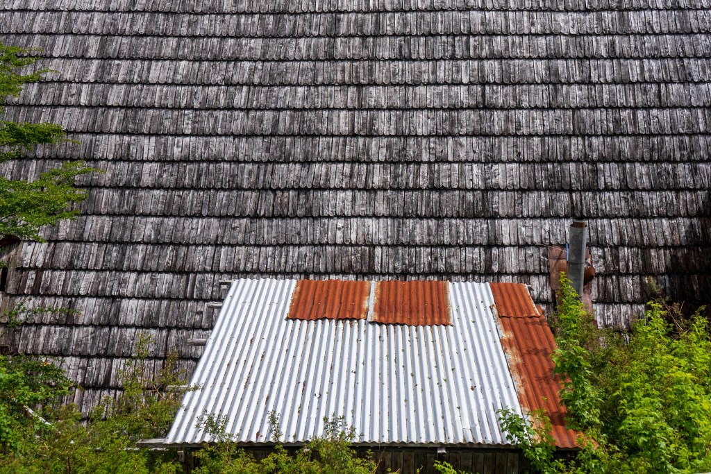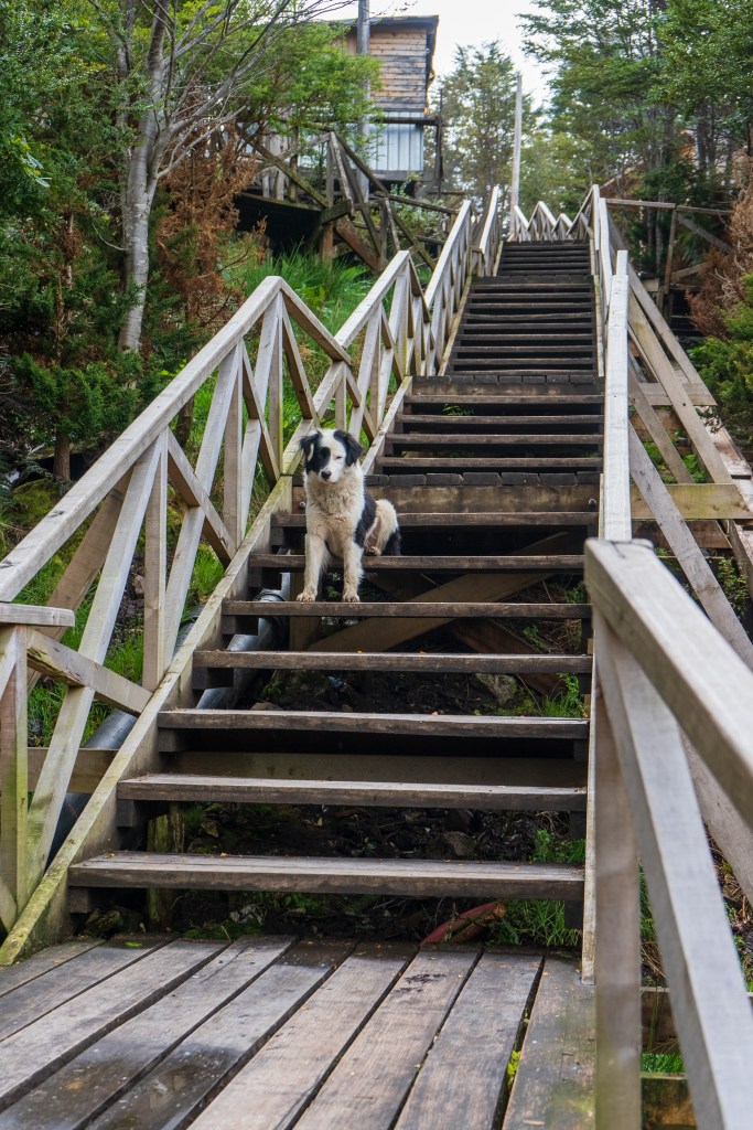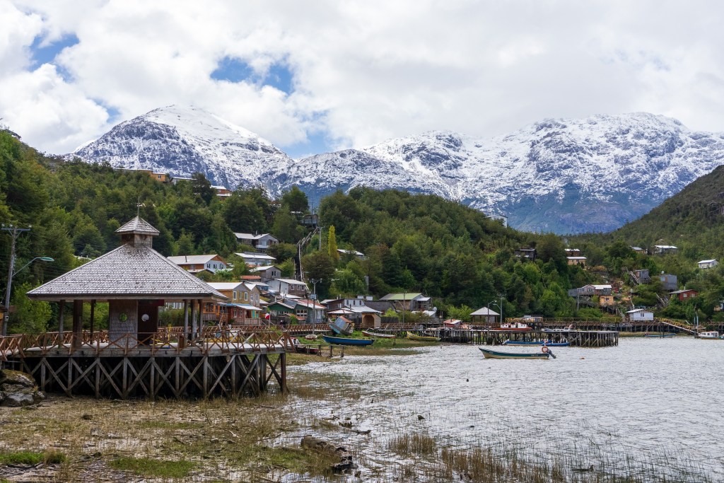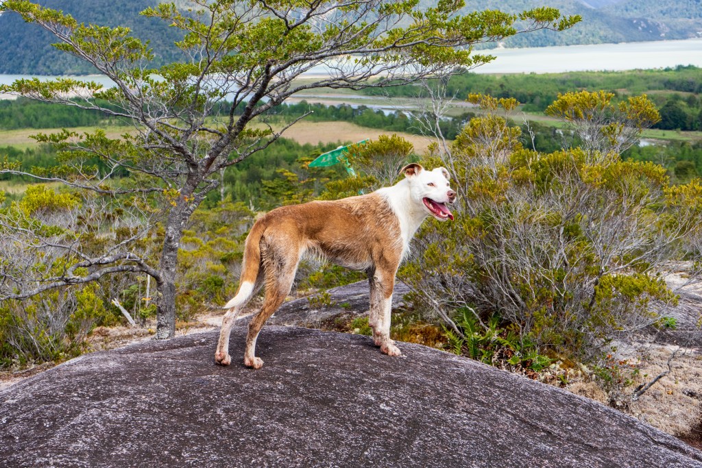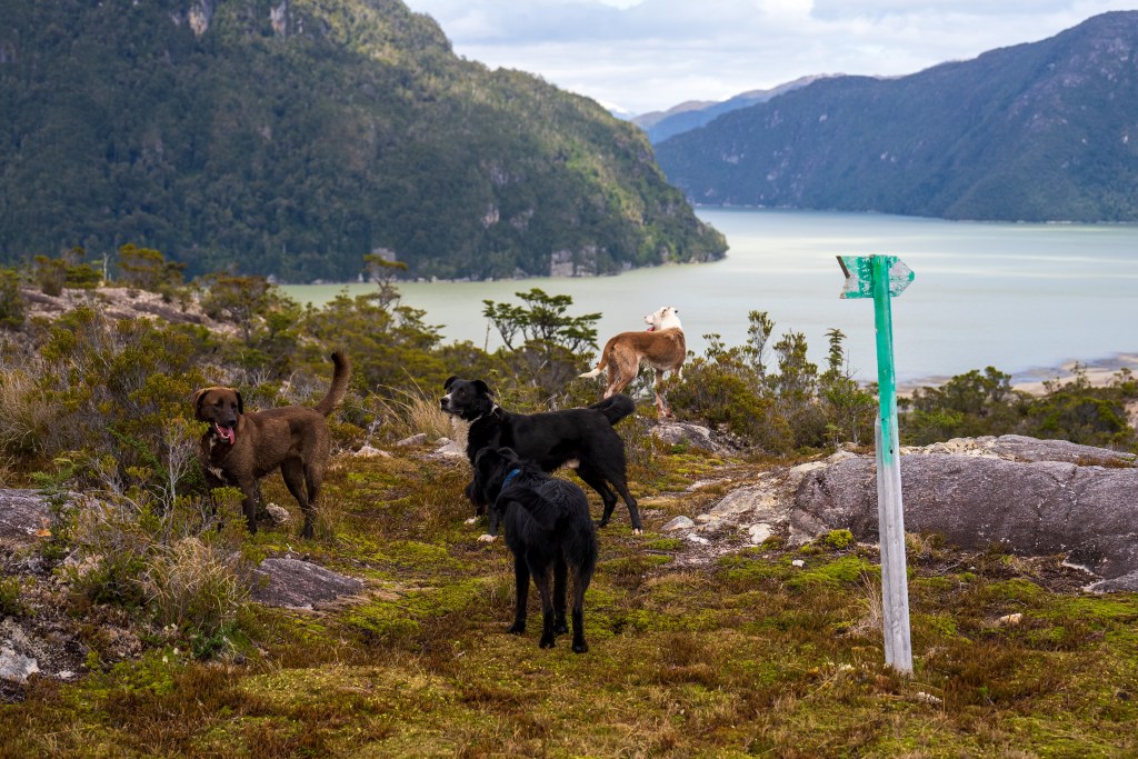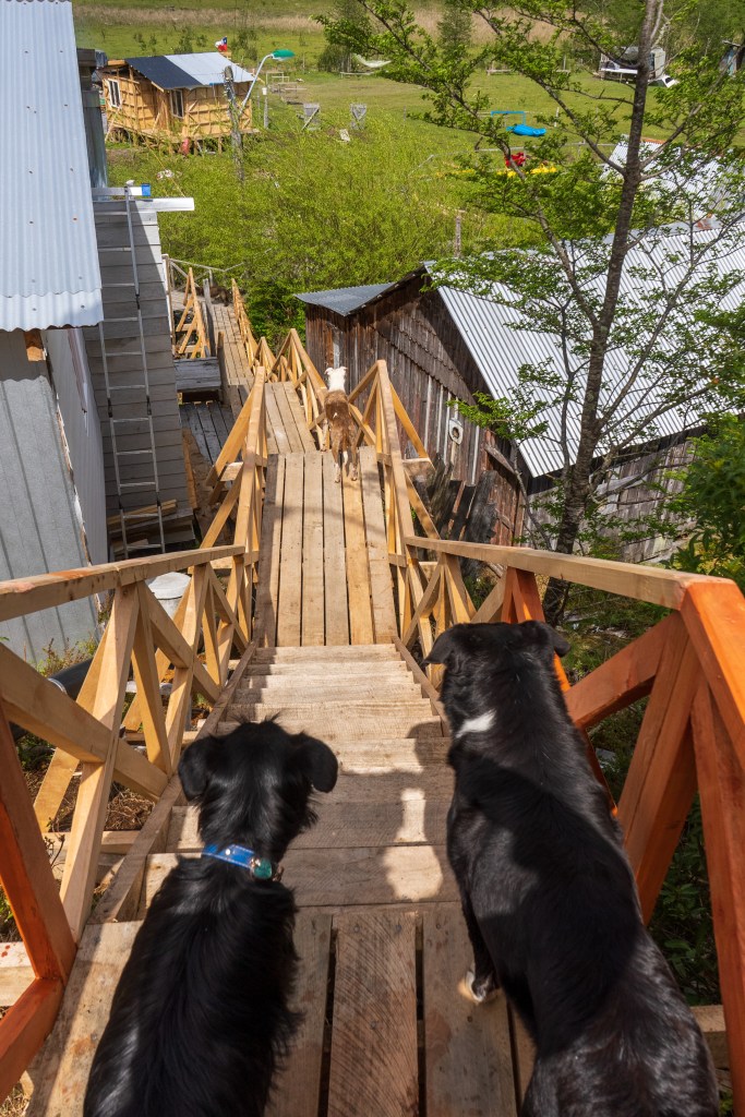 It was all seasons over the next few days, howling winds swept through, battering the small boats, and the snow-line stayed low on the mountains overlooking the cove. The boardwalks remained slick and I witnessed a few people take slips and falls, luckily nobody saw mine. One particularly treacherous path was the trail that looped around the town and connected both ends, parts of it composed of slippy beams, 30cm wide, staked into the the boggy ground. I walked it with a Spanish/Chilean couple who I’d met days before as they hitchhiked on the Careterra, they had got a ride with a German/Chilean pair and were all heading to the trail. I bumped into them sitting in the harbour drinking maté as the sun began to burn through the clouds and so I joined them walking towards the trail-head. Out towards the even quieter end of town piles of wood lay near where walkways were being repaired, boats in varied conditions leaned sideways on the marshes. The trail climbed up and around to give a view over the mouth of the Río Baker, along through the fjord and later down over the rest of Tortel. I hiked the trail again in the opposite direction a couple of days later when the sun returned, both times I was accompanied by what became a pack of local dogs, strays and pets. Ever up for the adventure a couple of dogs would start following and soon be joined by others, appearing seemingly out of nowhere on the backside of the hill.