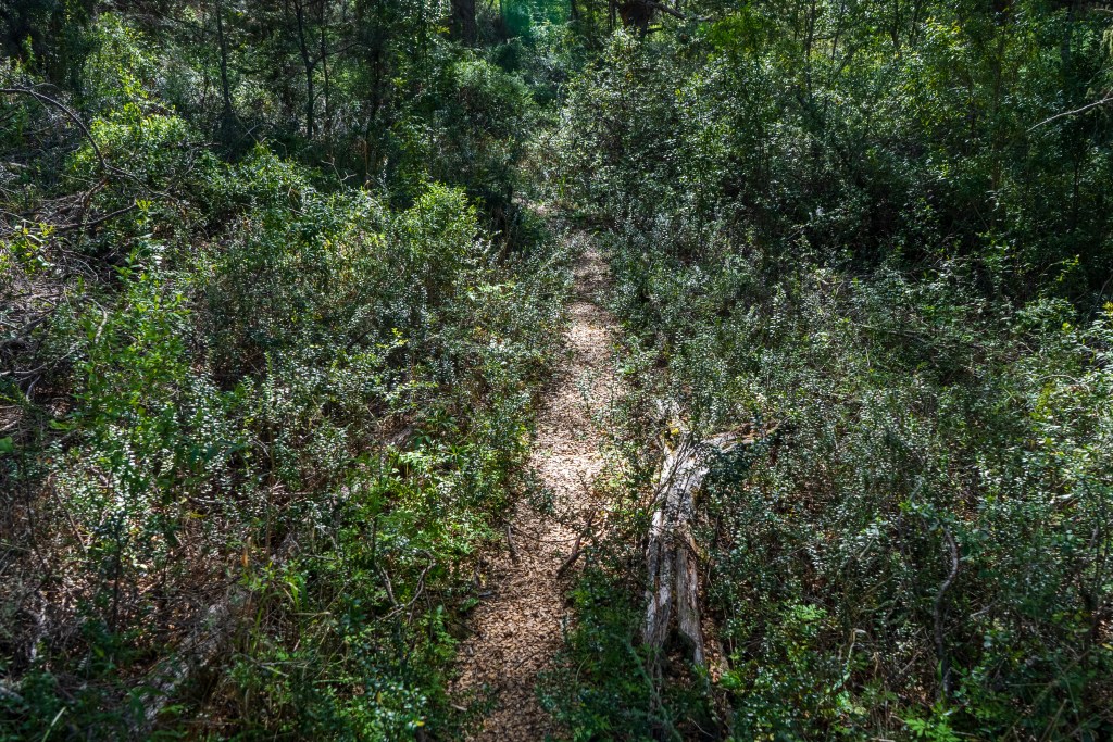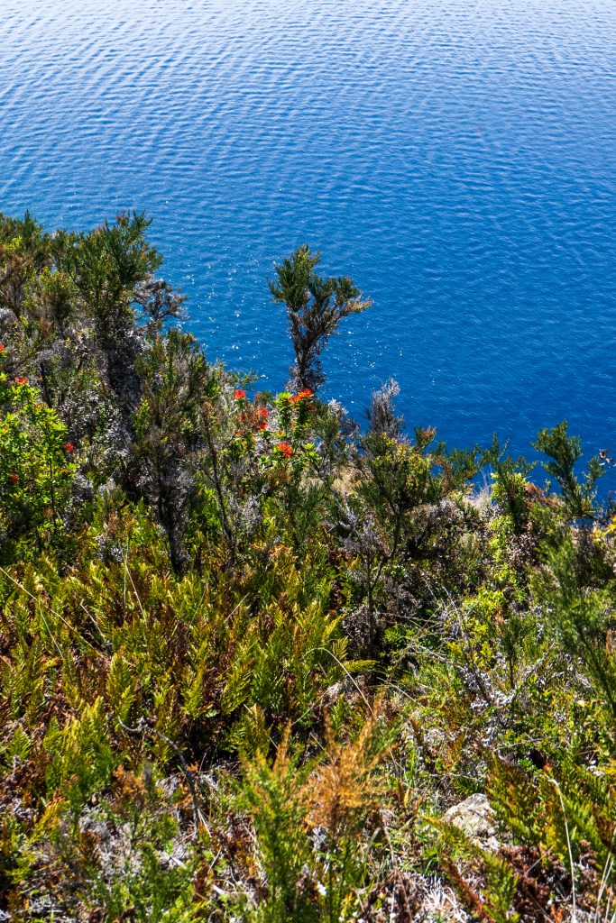 The trail was well marked and wound through the woods with some short and steep rocky parts, sometimes aided by wooden stairs. On one section, just before the loop began it’s climb and return, the single-track traversed a sloping cliff face with enough height and exposure to make you think twice about each step. The first half in the lower parts was cool and humid under the tall trees, the second half hot and dry above much of the canopy. I ate very well with my excess food, stopping by little sandy beaches or under shady trees to make avocado and cheese sandwiches and taking big handfuls of dried fruit and nuts in between. The sun was out strong and by the afternoon the dusty ground was baking and I was grateful for the frequent streams that would fill my bottle on their rush down to the lake.