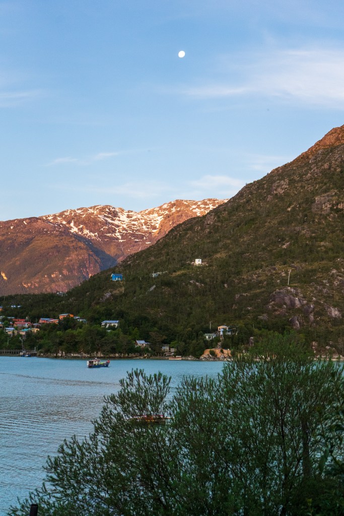 Before long the sky-blue car ferry had dropped one of it’s ramps on the slipway. An assortment of vehicles were aboard, arranged in three lines, chocked and strapped down to the deck having been picked up 2 hours before at a port with a road. There was only about 10 foot-passengers waiting along with myself and three other cyclists, we scrambled up the ramp and stashed our bikes in a gap between two shipping containers. We brought in our bags to the cabin area and climbed up the two floors to the viewing platform and watched as piles of lumber were brought on by a fork-lift then dumped, stacked and strapped in the remaining deck space. This went on for another hour under the spotlights as stray dogs from the port sniffed about between the vehicles. Not long before midnight we pulled away from Tortel and headed towards the layers of shadowy mountains, rising up from still black water, only made visible by a moon 3 days from full.