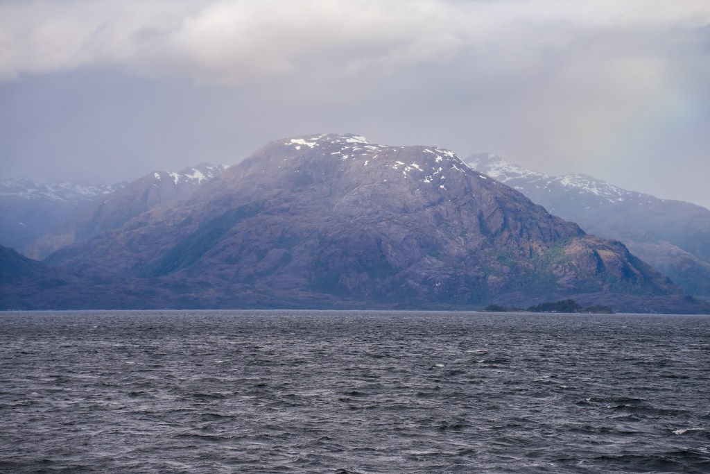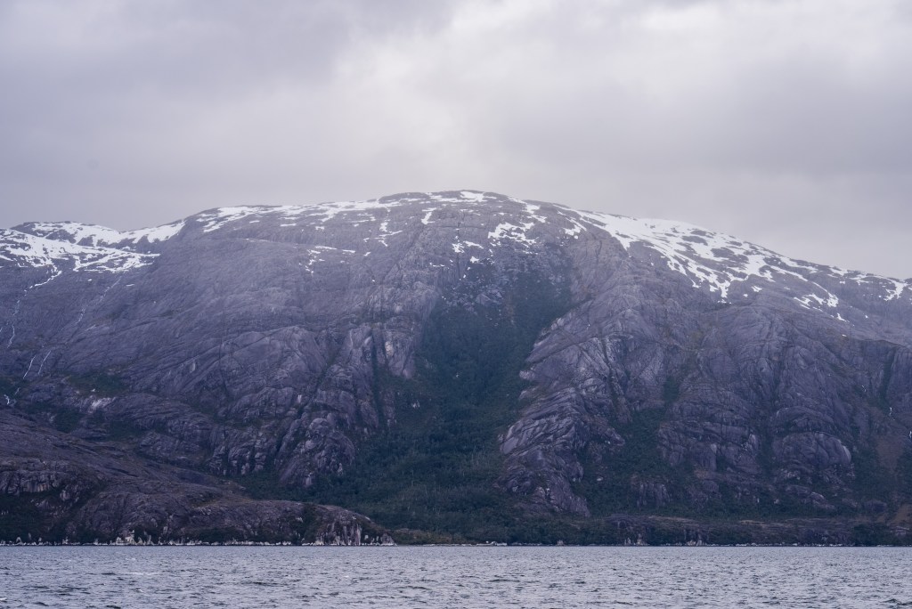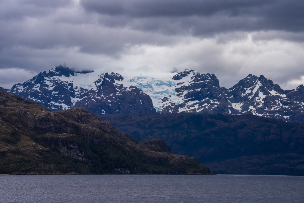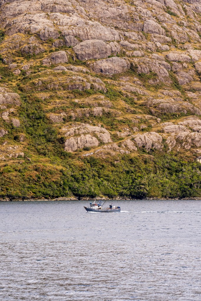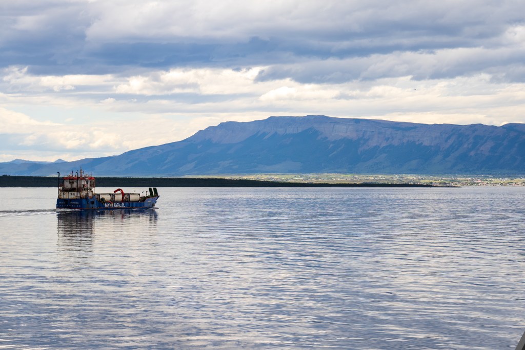 The second day began our approach the Puerto Natales. In the distance we could catch glimpses of overhanging glaciers and the exposed edges of the Southern Patagonian Ice Field, one of the largest bodies of ice outside of the poles. As we neared the southern city we encountered more traffic on the channels, fishing boats, supply ships and a scientific survey barge joined us on our way. As we navigated the final narrows the lay of the land became apparent in the whole; the tail end of the Andes coming from the left descended towards the plains on the right, Puerto Natales sat between the two in the shadow of an imposing wall of rock, no doubt cut by some ancient glacier. In the very distance the famous towers of Torres del Paine could just be distinguished through a gap between closer peaks.