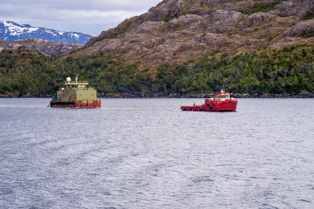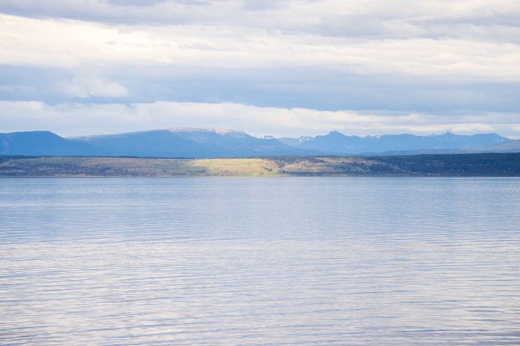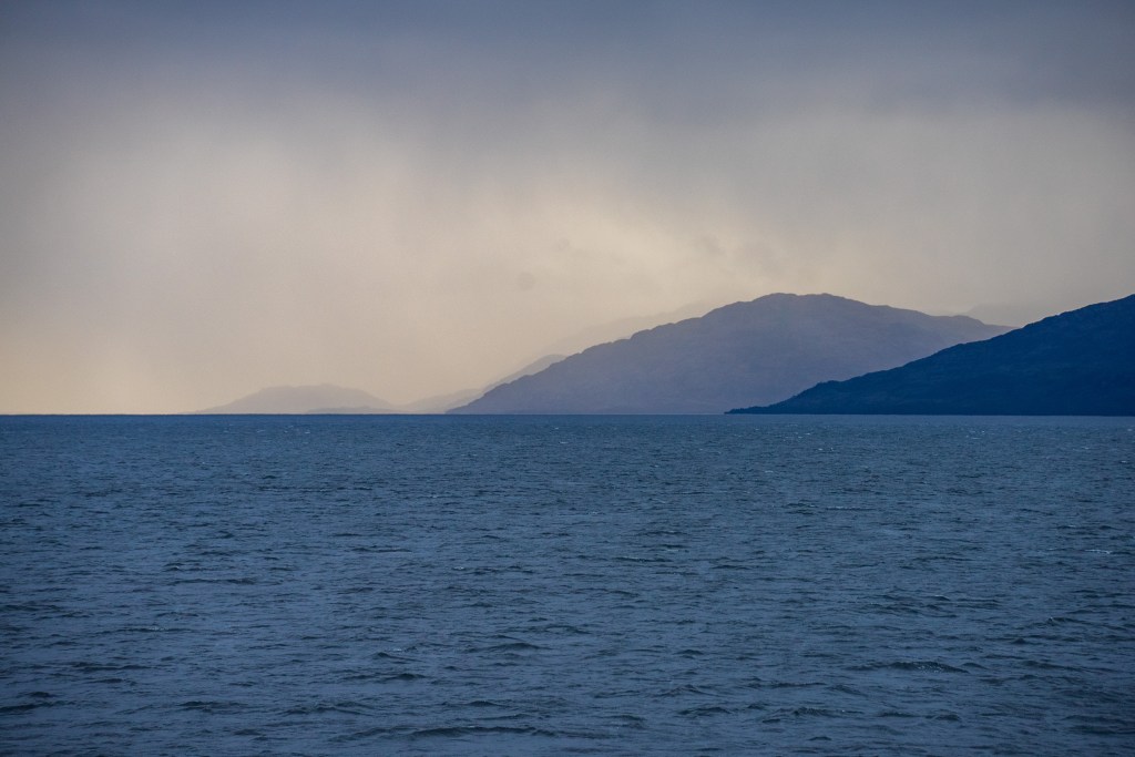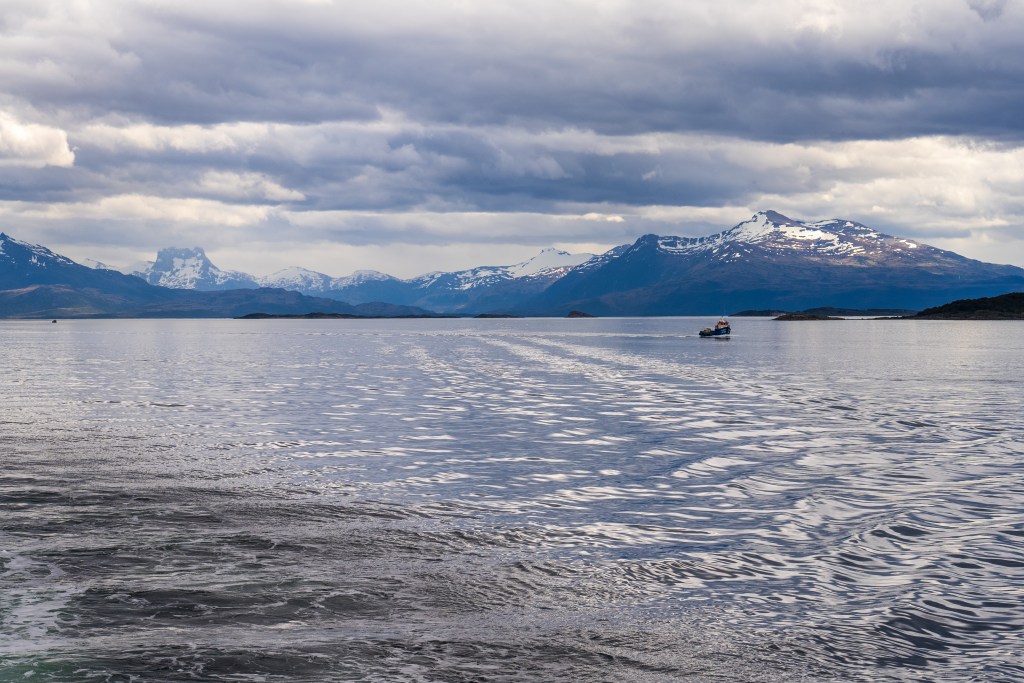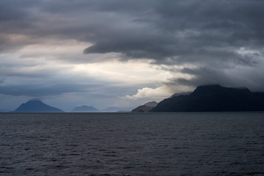 The second day began our approach the Puerto Natales. In the distance we could catch glimpses of overhanging glaciers and the exposed edges of the Southern Patagonian Ice Field, one of the largest bodies of ice outside of the poles. As we neared the southern city we encountered more traffic on the channels, fishing boats, supply ships and a scientific survey barge joined us on our way. As we navigated the final narrows the lay of the land became apparent in the whole; the tail end of the Andes coming from the left descended towards the plains on the right, Puerto Natales sat between the two in the shadow of an imposing wall of rock, no doubt cut by some ancient glacier. In the very distance the famous towers of Torres del Paine could just be distinguished through a gap between closer peaks.