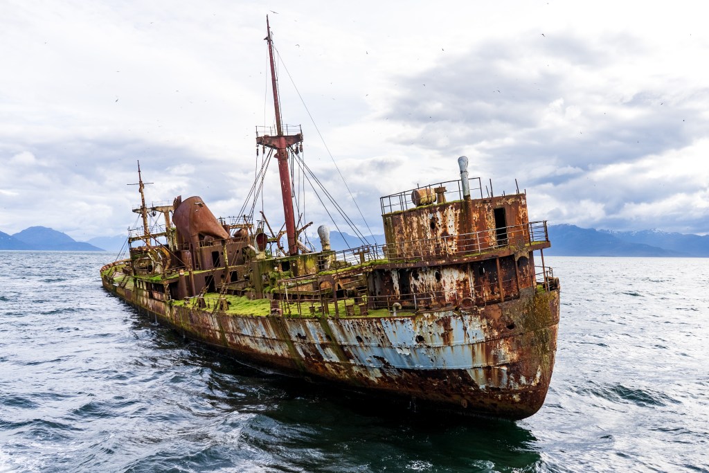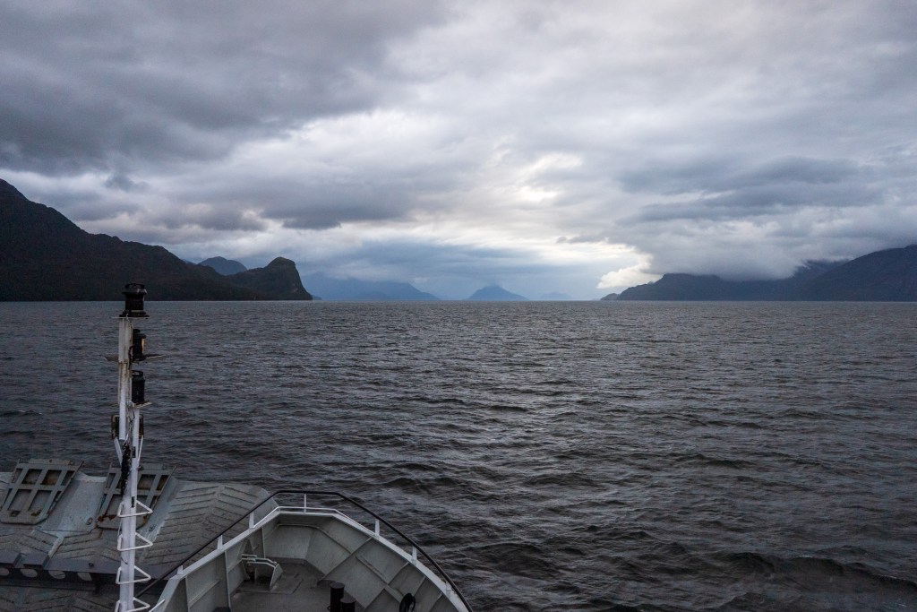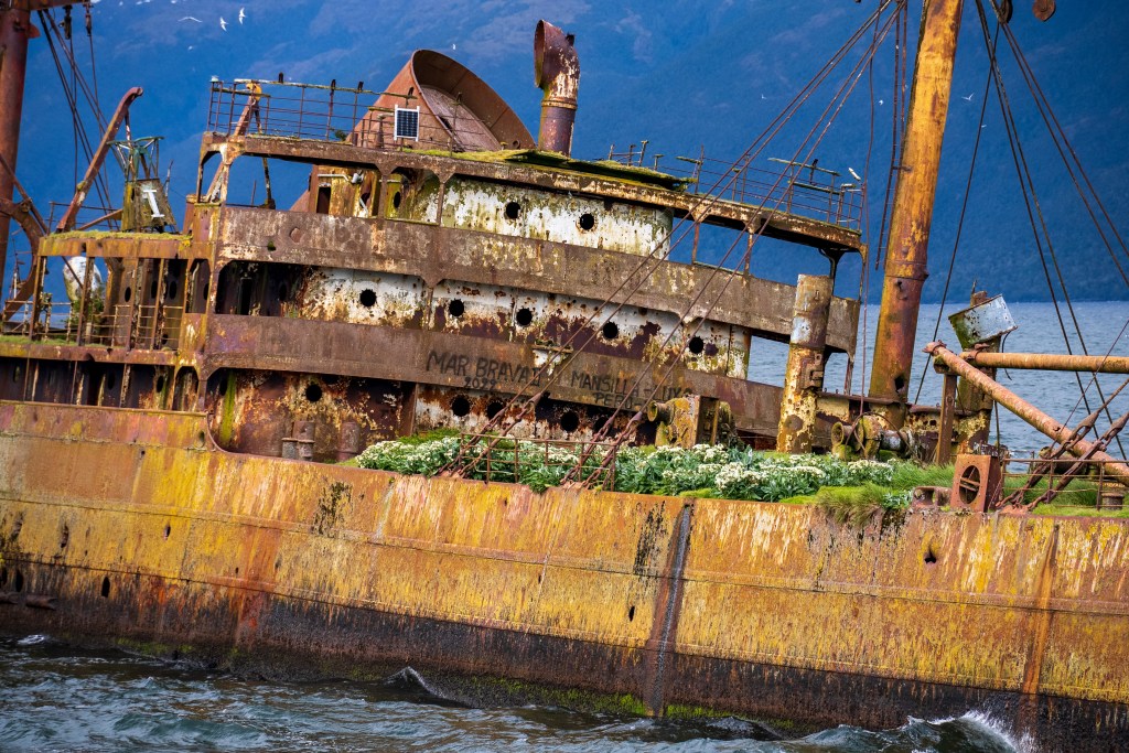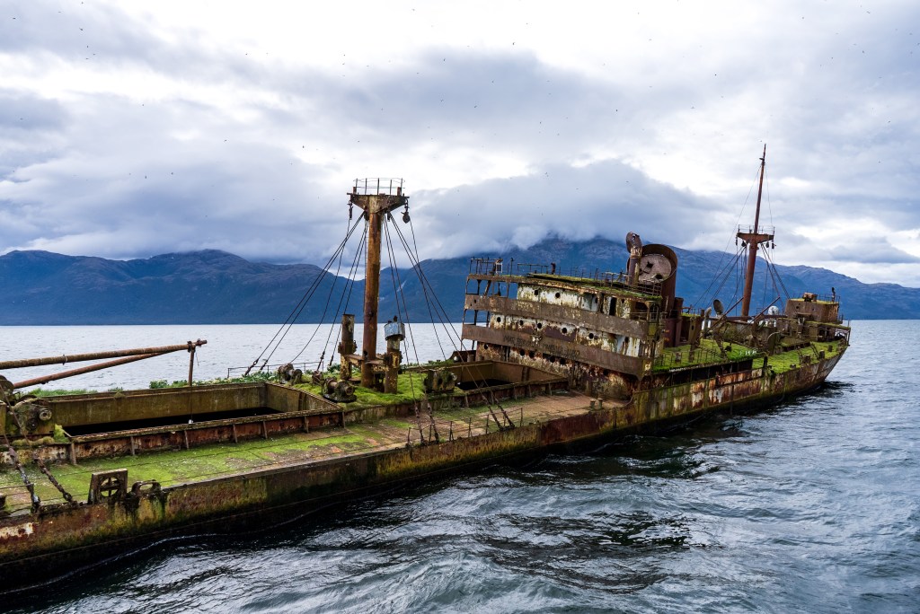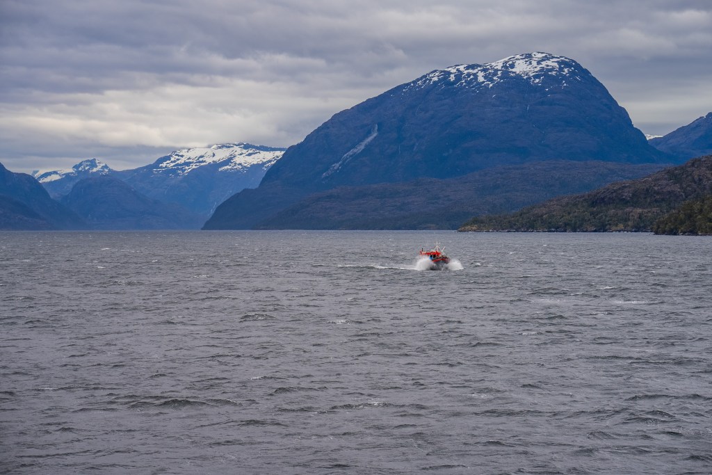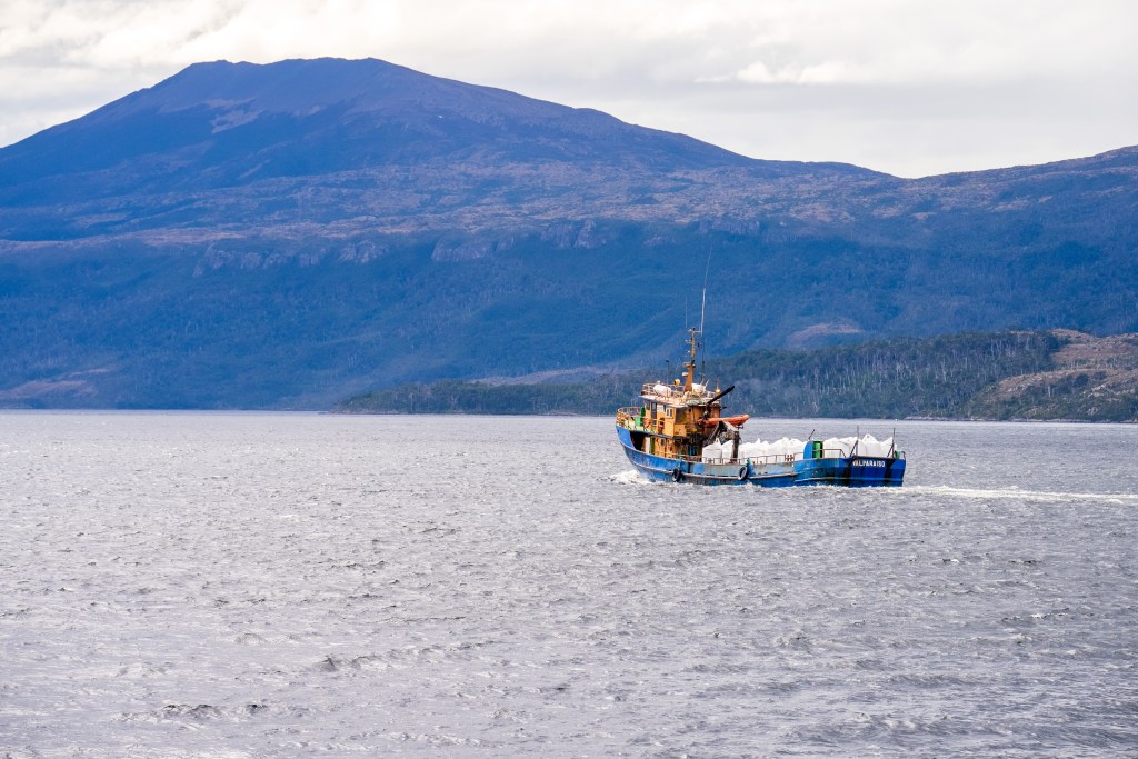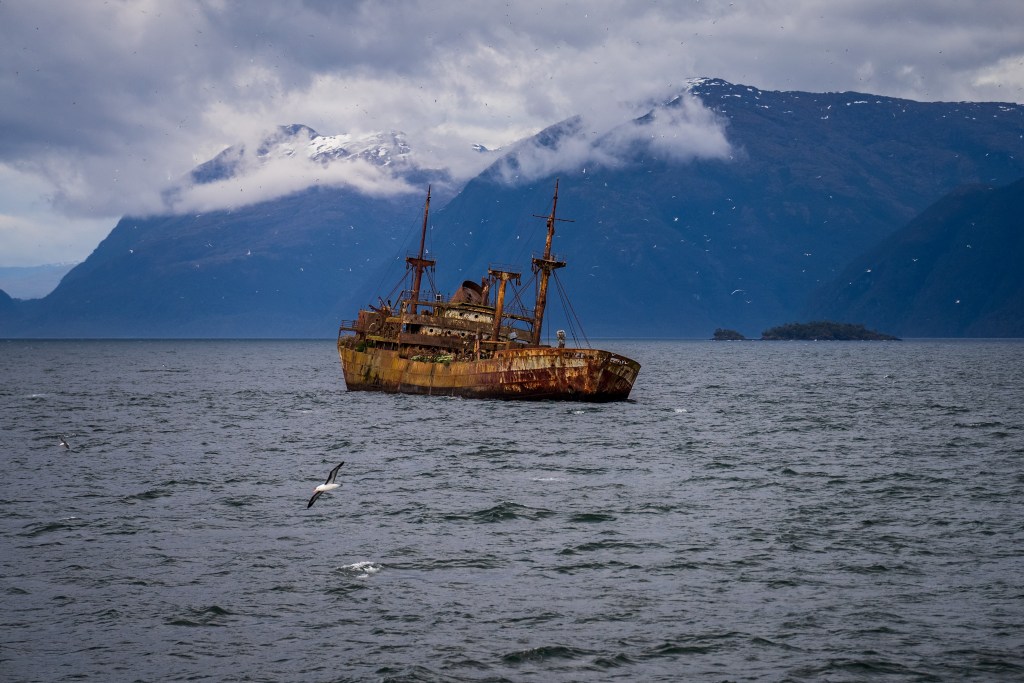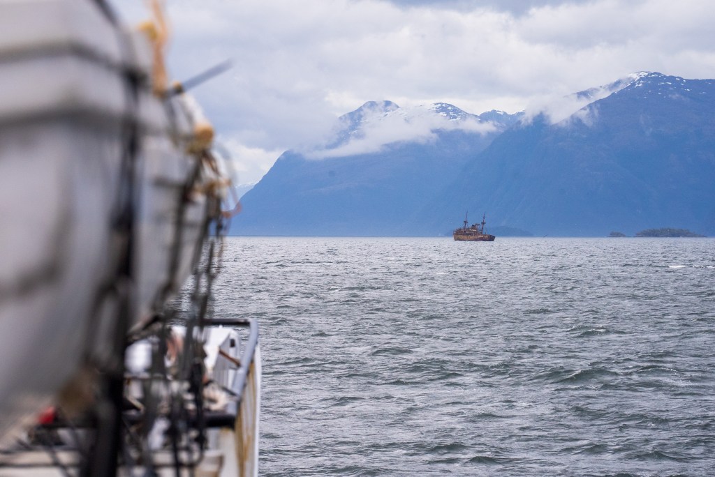 Towards the afternoon a shipwreck appeared on the horizon, leaning gently to one side in the middle of the channel. As we approached the wreck the thousands of birds nested there scattered angrily into the sky and the ferry slowed and circled around just metres away. Grass grew on the upward decks and holes dotted the rusted sides, apparently from Chilean navy target practice from a period of tension with Argentina. The other break in the consistent grand scenery was a stop at the remote village of Puerto Eden, an island outpost of a few cabins and municipal buildings, it’s only contact with the rest of the world the weekly ferry dropping supplies and picking up pallets of locally gathered shellfish for trade in the city.