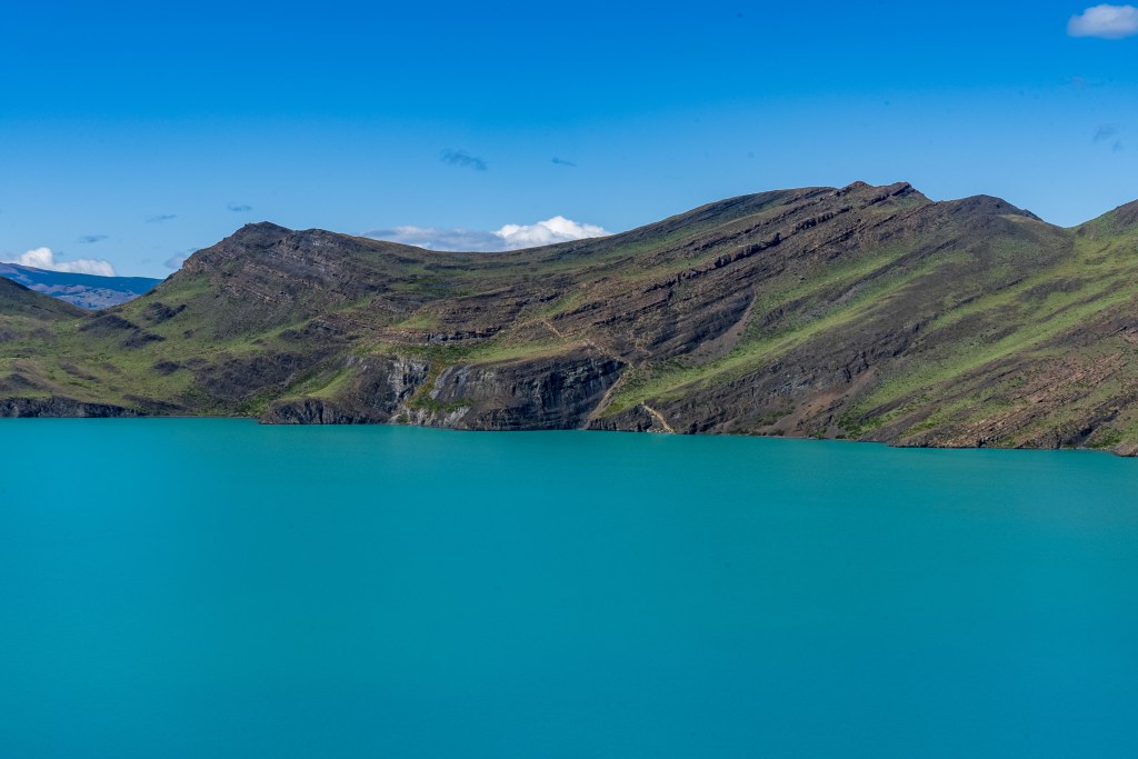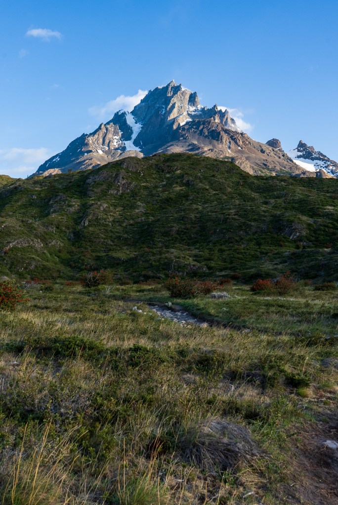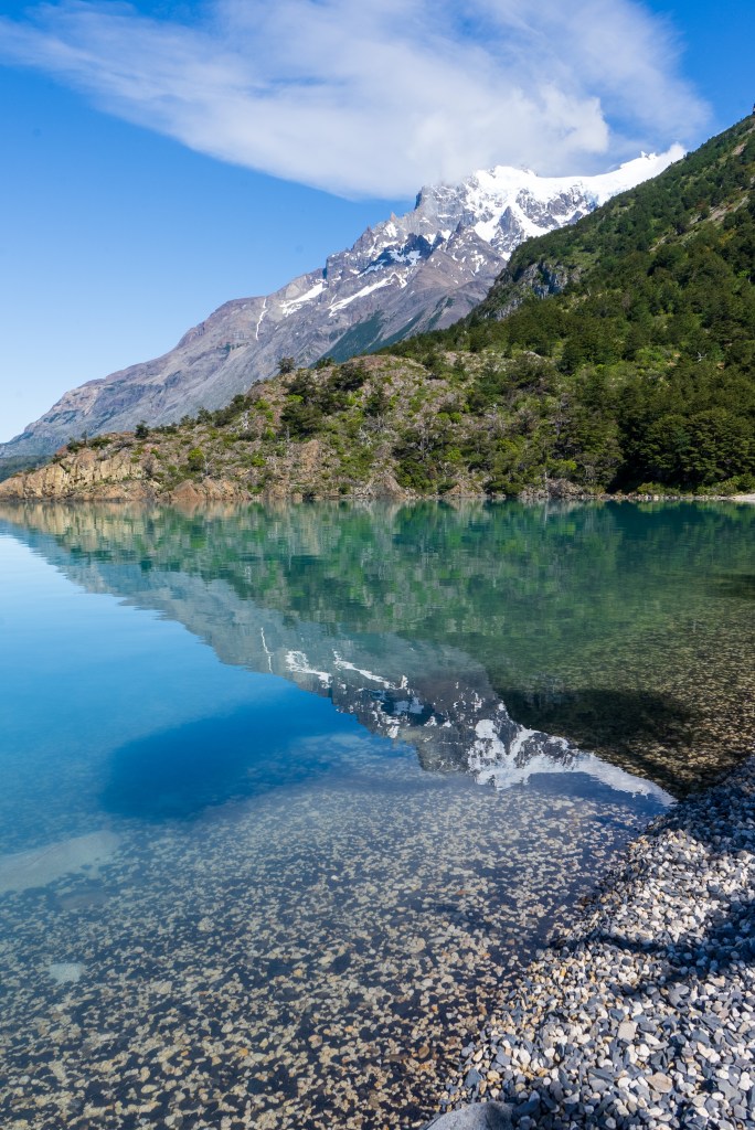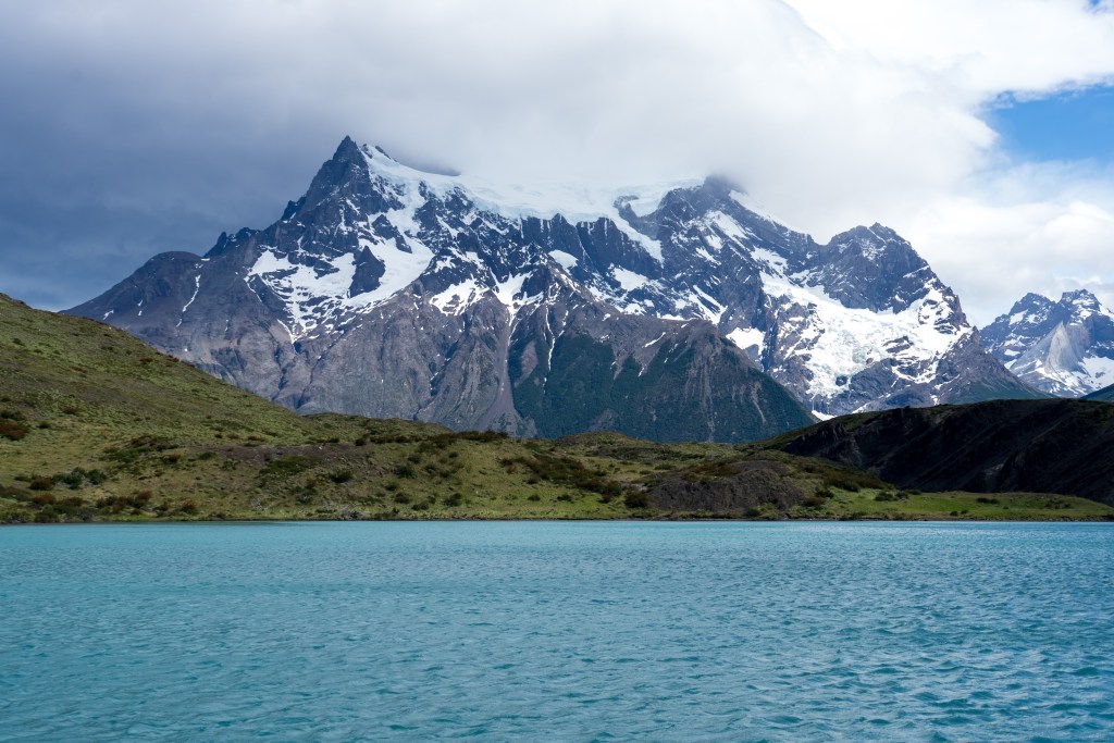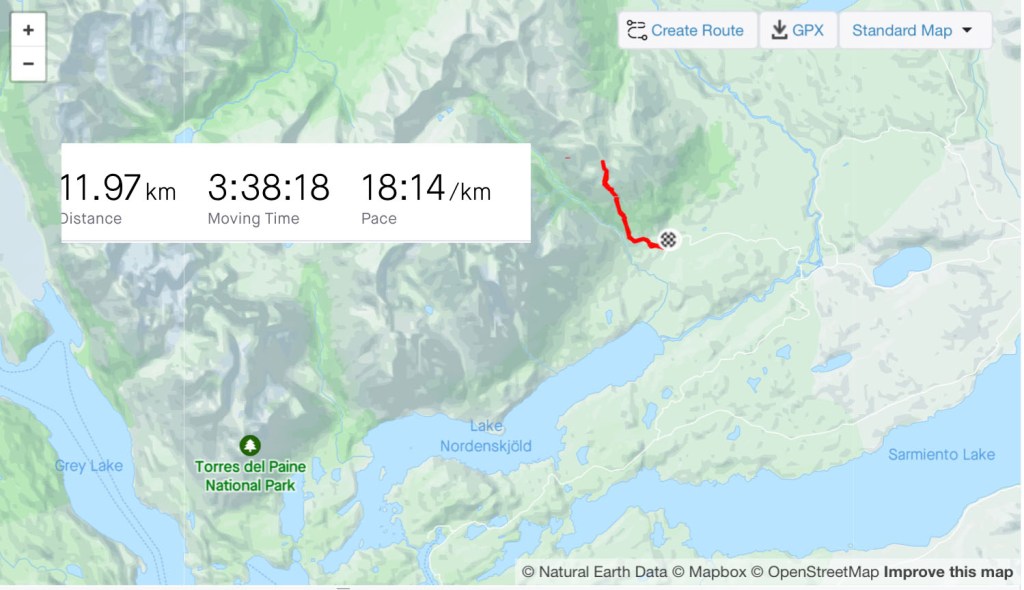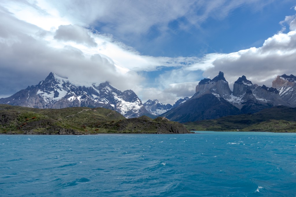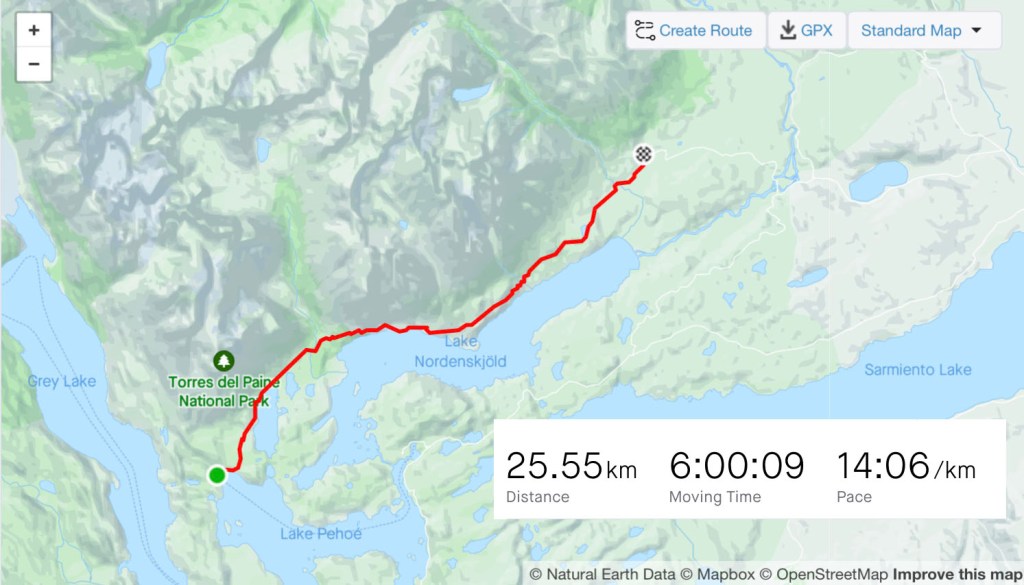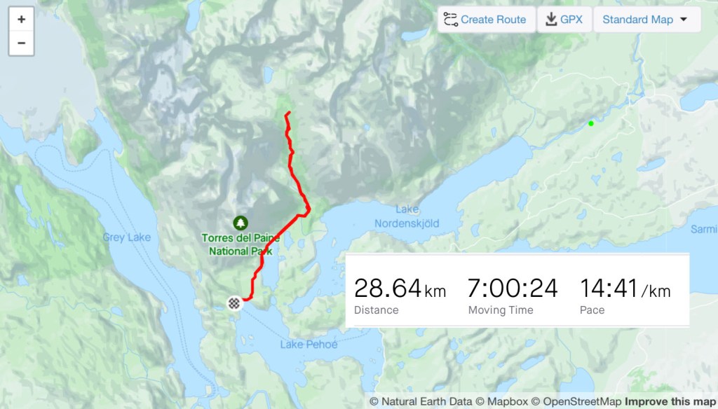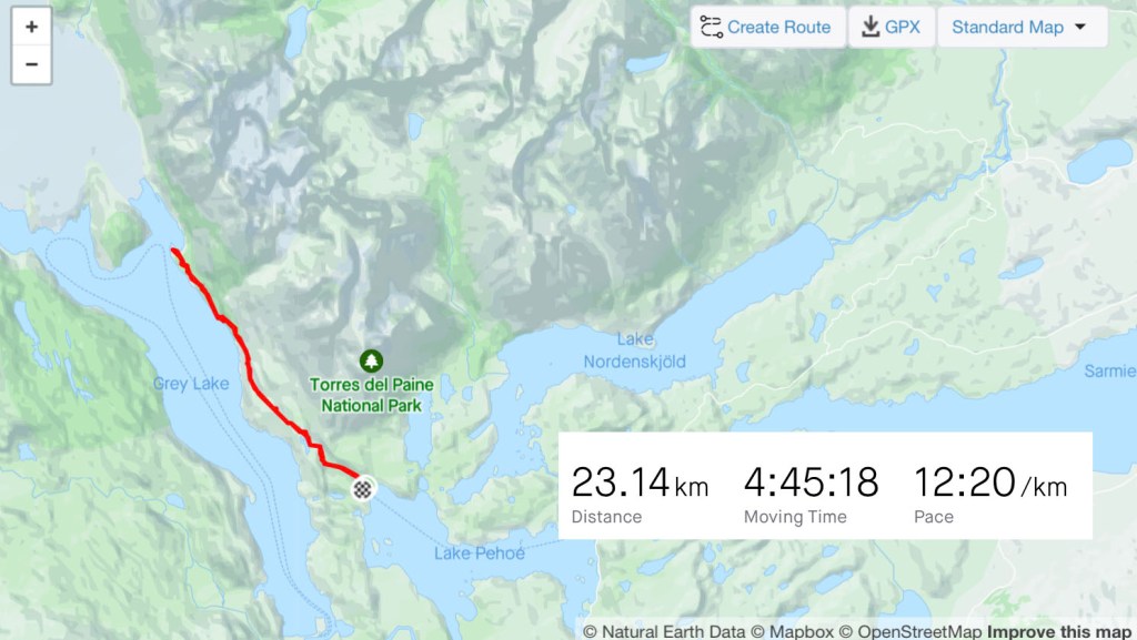 I packed what I needed and left the rest, including my bike, at the campsite and caught the early bus. It dropped me at a small pier on the edge of Lago Pehoe from where a boat took 50 or so hikers westward across the lake to the first campsite. The ‘W’ is named so for the shape of the route it takes around two mountains. If you imagine two peaks making up the downward empty space in the W and the lines of the letter representing the valleys between them. The first campsite of Paine Grande sits at the bottom-left point of the W. I’d be spending two nights there, hiking return trails to the to the top-left and the centre point. The third day would be crossing to the bottom-right point and the final day up to the famous towers at the top-right.
