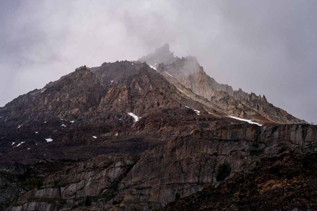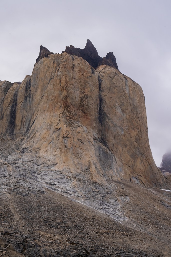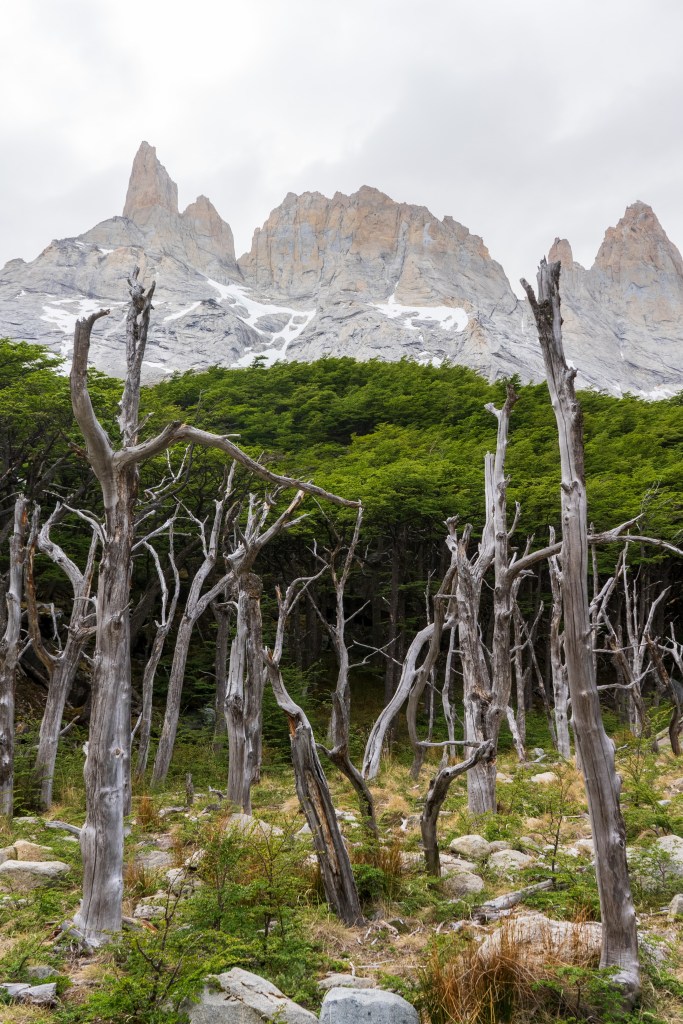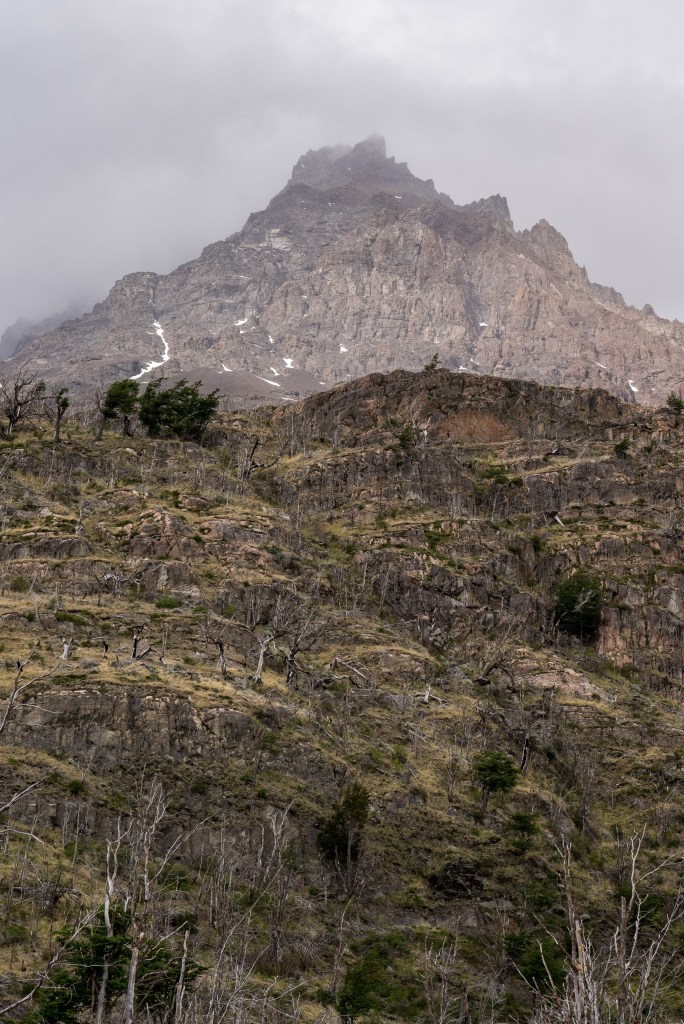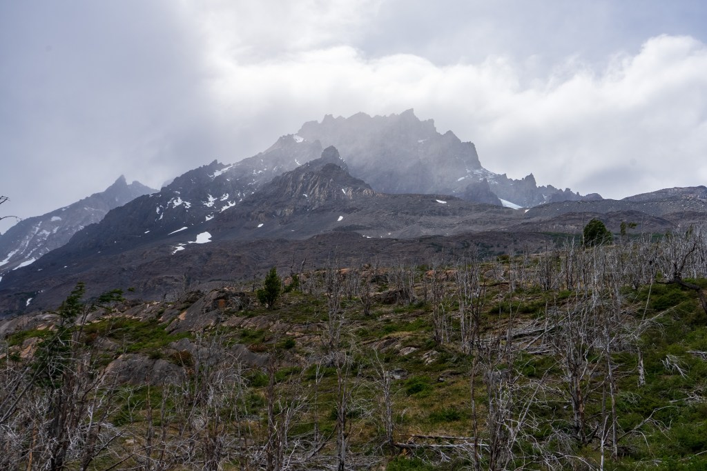 The next morning I was up early and one of the first on the trail. Today was to be my longest day, about 28km return trip but again I was with a day-bag not my full pack. I picked up two sturdy looking sticks and marched off to the north-east through the dead forest. In 2011 a wildfire was ignited by a hiker burning toilet paper, it spread across 40,000 acres of the park and took nine days to bring under control. The barren silver tree trunks in this sector of the park, killed but not burnt, still stand as an eerie reminder. Yesterday’s cloudy mountain stood on my left now and the second ridge came into view, I was aiming for the valley in between. The far side was beyond epic; a two-toned table-top castle of a mountain with vertical cliffs, clouds hanging off the face. I reached the entrance to the valley between the peaks and passed through two closed campsites. The park rangers were on strike so certain places were closed but one could still pass through. The rangers have been fighting poor working conditions and insufficient pay and their signs and black flags were everywhere. Unfortunately it felt that their position was a difficult one, the other campsites are run by private companies so much of the park’s revenue is channeled through them, the rangers don’t seem to have much bargaining power as they couldn’t close the park entirely. Even towards the towers, the park’s main attraction, where they were partly dismantling bridges, they couldn’t really enforce a closure beyond refusing rescue, their actions felt mostly symbolic.
