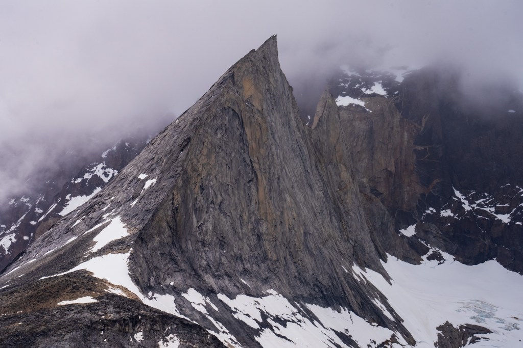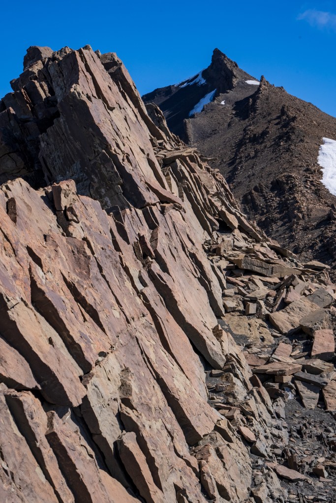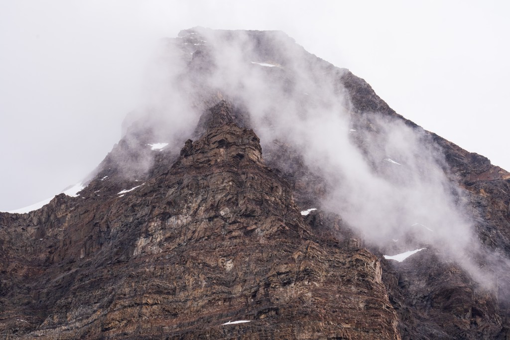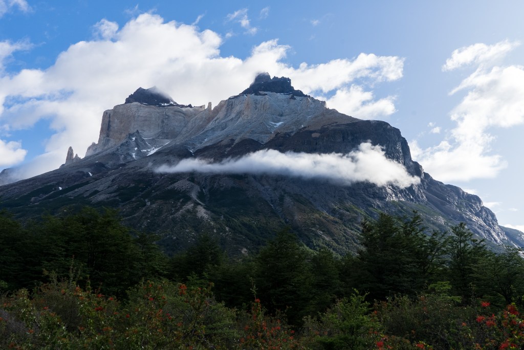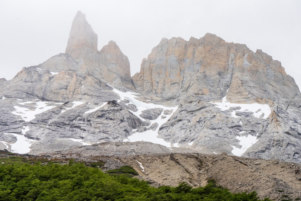 The next morning I was up early and one of the first on the trail. Today was to be my longest day, about 28km return trip but again I was with a day-bag not my full pack. I picked up two sturdy looking sticks and marched off to the north-east through the dead forest. In 2011 a wildfire was ignited by a hiker burning toilet paper, it spread across 40,000 acres of the park and took nine days to bring under control. The barren silver tree trunks in this sector of the park, killed but not burnt, still stand as an eerie reminder. Yesterday’s cloudy mountain stood on my left now and the second ridge came into view, I was aiming for the valley in between. The far side was beyond epic; a two-toned table-top castle of a mountain with vertical cliffs, clouds hanging off the face. I reached the entrance to the valley between the peaks and passed through two closed campsites. The park rangers were on strike so certain places were closed but one could still pass through. The rangers have been fighting poor working conditions and insufficient pay and their signs and black flags were everywhere. Unfortunately it felt that their position was a difficult one, the other campsites are run by private companies so much of the park’s revenue is channeled through them, the rangers don’t seem to have much bargaining power as they couldn’t close the park entirely. Even towards the towers, the park’s main attraction, where they were partly dismantling bridges, they couldn’t really enforce a closure beyond refusing rescue, their actions felt mostly symbolic.