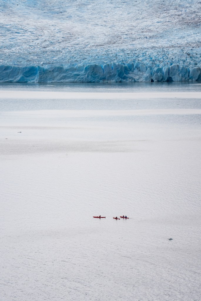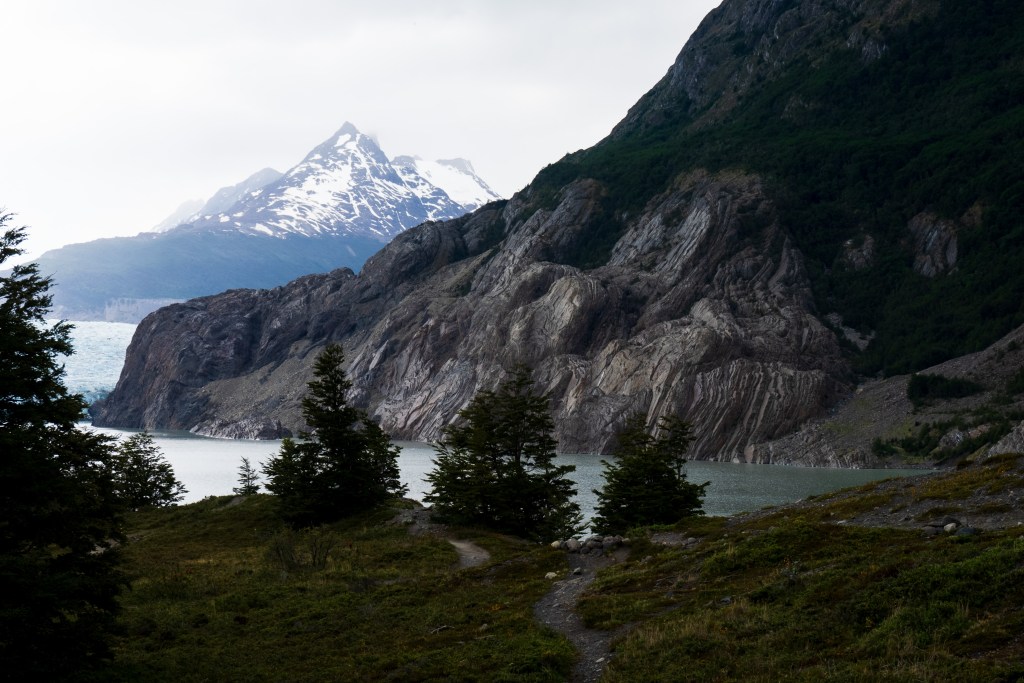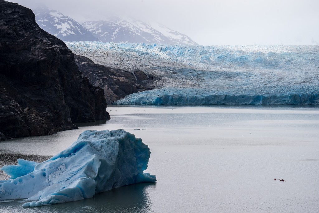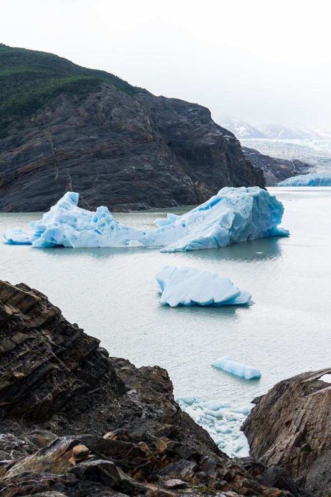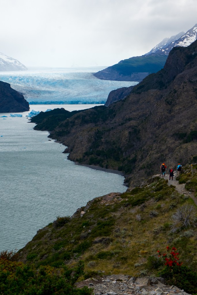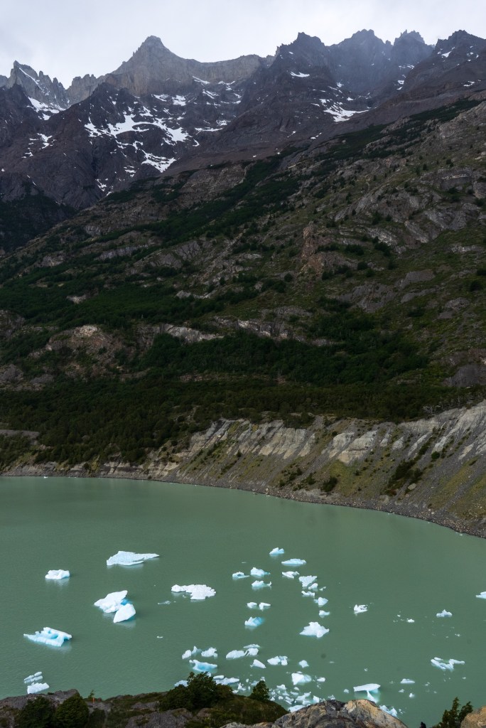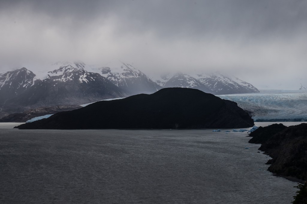 I arrived at around midday and set up my tent and packed a day-bag before heading up the left leg towards the Grey Glacier. It was an overcast day with a strong wind and patches of rain, which didn’t hinder the hike but the clouds sweeping over the peak to my right gave an ominous look to the rugged mountain. Lago Grey stretched up along to my left and before long small blue icebergs could be seen floating down from the yet unseen glacier. The route was pretty busy, people heading with me from the boat clambered upwards and more than a few exhausted looking faces headed downwards; “O-trekkers” on their final day. Up and down through silver forests and across a few streams I walked with a fast pace along the 11km path, knowing that I still had to return that day. When the glacier finally came into view the scale was astonishing. It was a wall of ice in the distance that stretched backwards and faded out of sight into a low white sky. Surrounding walls made a moody dark by the overcast light highlighted the bright ice even more. I passed through another campsite and headed to a viewpoint as close to the glacier as possible where I spent about half an hour sat looking out across the now massive icebergs that floated in front. A group of kayaks paddled behind the largest of the bergs and towards the glacier face, giving some sense of scale but still it was incomprehensible. Twice I heard a thundering crack echo down the valley as the ice shifted. Aware of time I started back the way I came, the route was now completely empty and I made a good pace back to camp where groups of hikers cooked and ate in a large communal hall.
