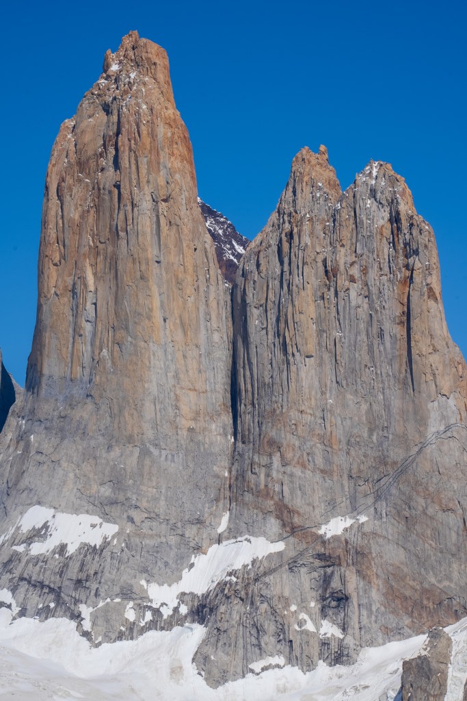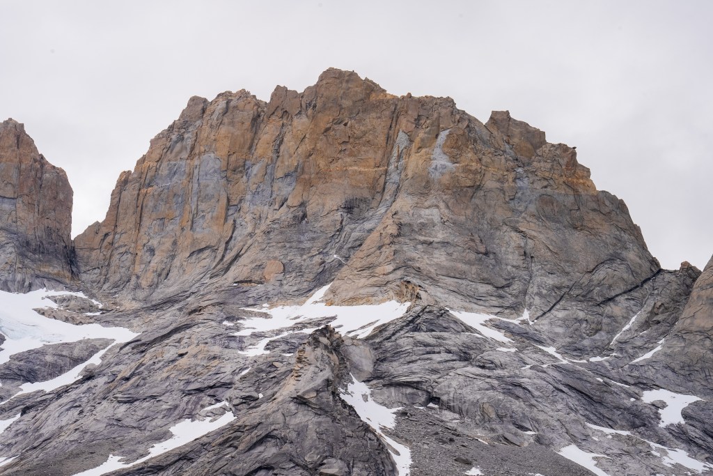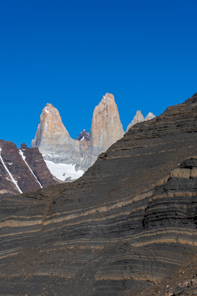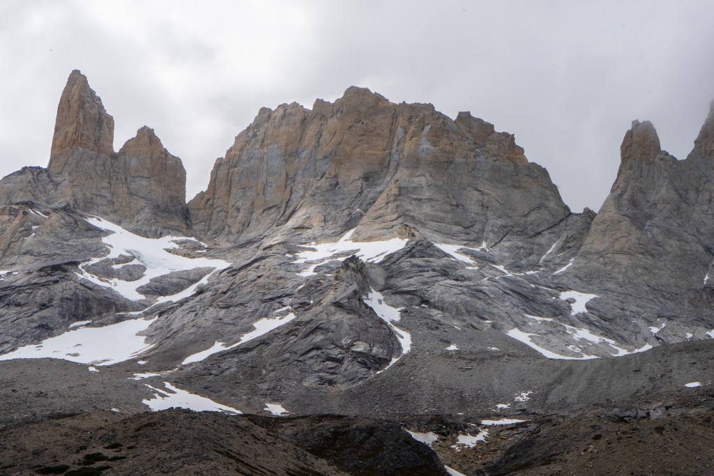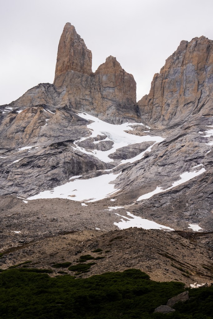 Because of the ranger’s strike there were many rumours about the access to the towers. Unwilling to risk not making it and on good info from someone who’d done it the day before, myself and two others decided to hike Cerro Paine instead of the regular trail to the base of the towers. Cerro Paine is the peak opposite the towers and a much steeper and less used trail leads up to a spectacular view over the towers and the lake at the bottom. We were the first people up there in the morning. A hot climb took us above the tree-line and onto red rock scree. We reached the viewpoint and decided to climb higher, another steep scramble along the edge of a snow field took us to a sharp ridge where we could see the lake in it’s entirety. Looking back over the way we came we could see for miles over the planes towards Puerto Natales. The scale of the towers was astounding. Even having seen photos I was not prepared for the imposing vertical monoliths and the bowl of trapped water at their base. It looked as it half a mountain had collapsed or exploded at some point in the distant past, leaving only these enormous fragments of the interior and exposing their ancient rock. Minds blown we descended again to the campsite where I had the rest of the day to relax in the sun before catching the bus back to town.