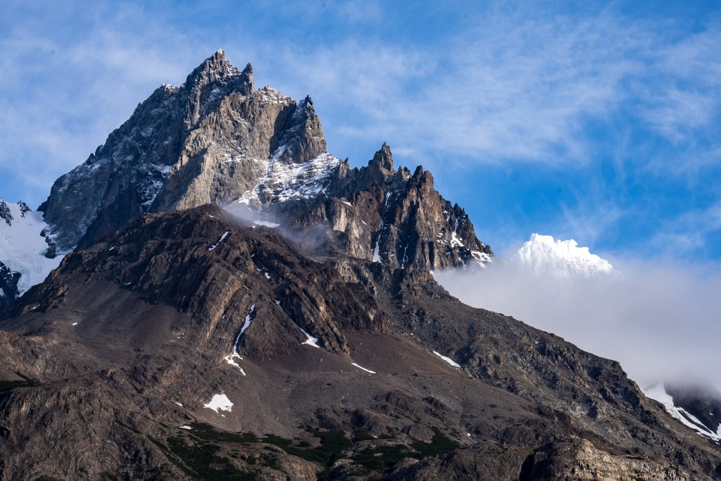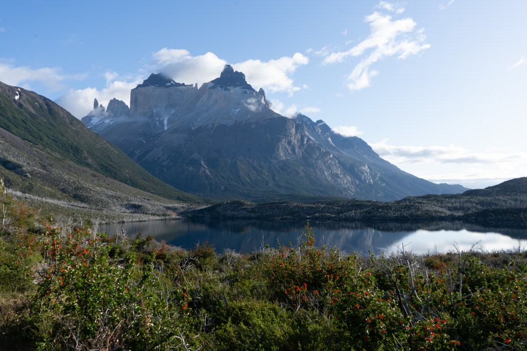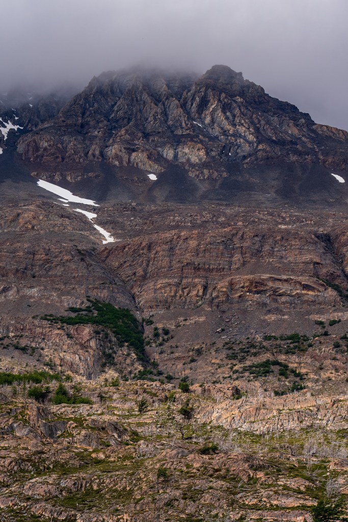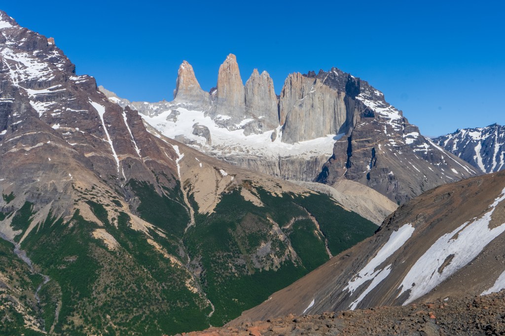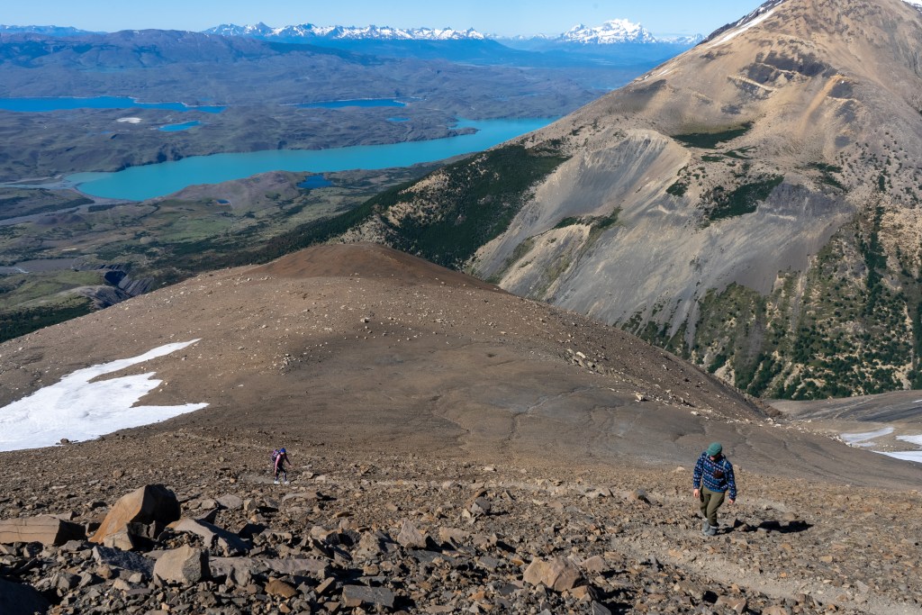 Because of the ranger’s strike there were many rumours about the access to the towers. Unwilling to risk not making it and on good info from someone who’d done it the day before, myself and two others decided to hike Cerro Paine instead of the regular trail to the base of the towers. Cerro Paine is the peak opposite the towers and a much steeper and less used trail leads up to a spectacular view over the towers and the lake at the bottom. We were the first people up there in the morning. A hot climb took us above the tree-line and onto red rock scree. We reached the viewpoint and decided to climb higher, another steep scramble along the edge of a snow field took us to a sharp ridge where we could see the lake in it’s entirety. Looking back over the way we came we could see for miles over the planes towards Puerto Natales. The scale of the towers was astounding. Even having seen photos I was not prepared for the imposing vertical monoliths and the bowl of trapped water at their base. It looked as it half a mountain had collapsed or exploded at some point in the distant past, leaving only these enormous fragments of the interior and exposing their ancient rock. Minds blown we descended again to the campsite where I had the rest of the day to relax in the sun before catching the bus back to town.
