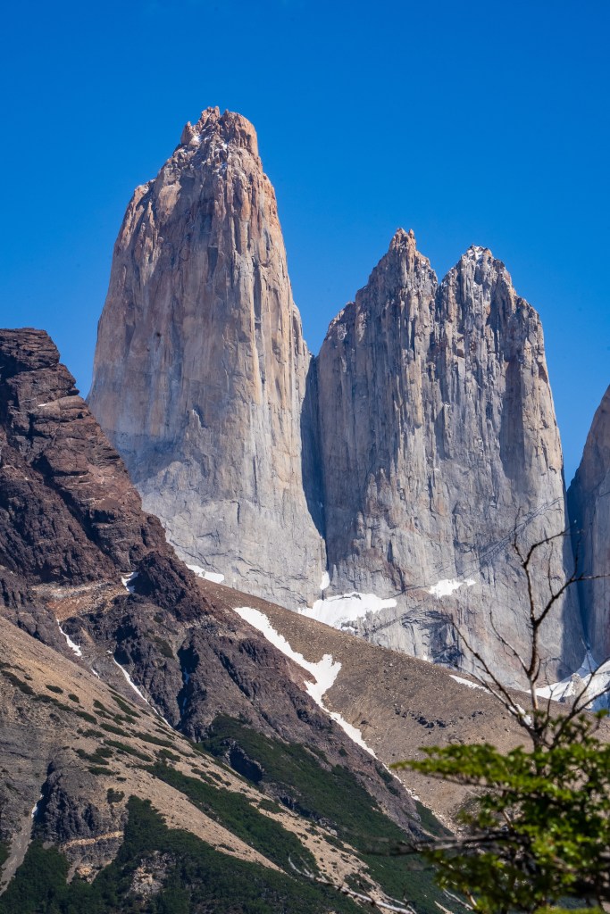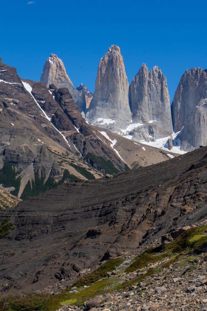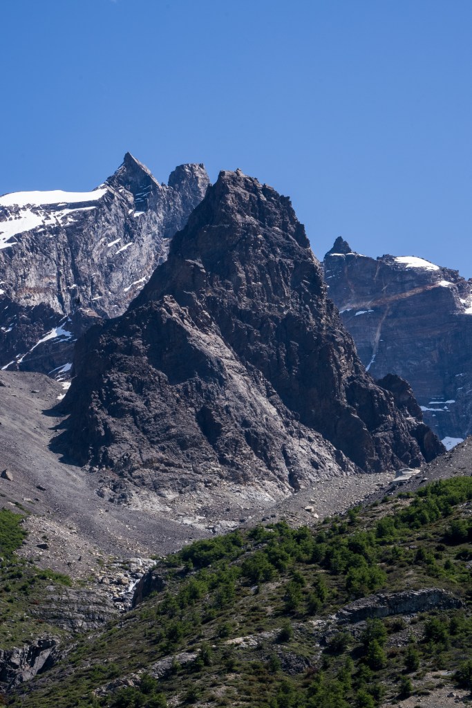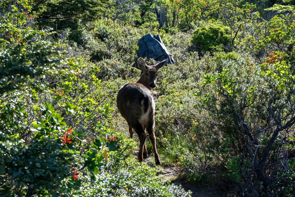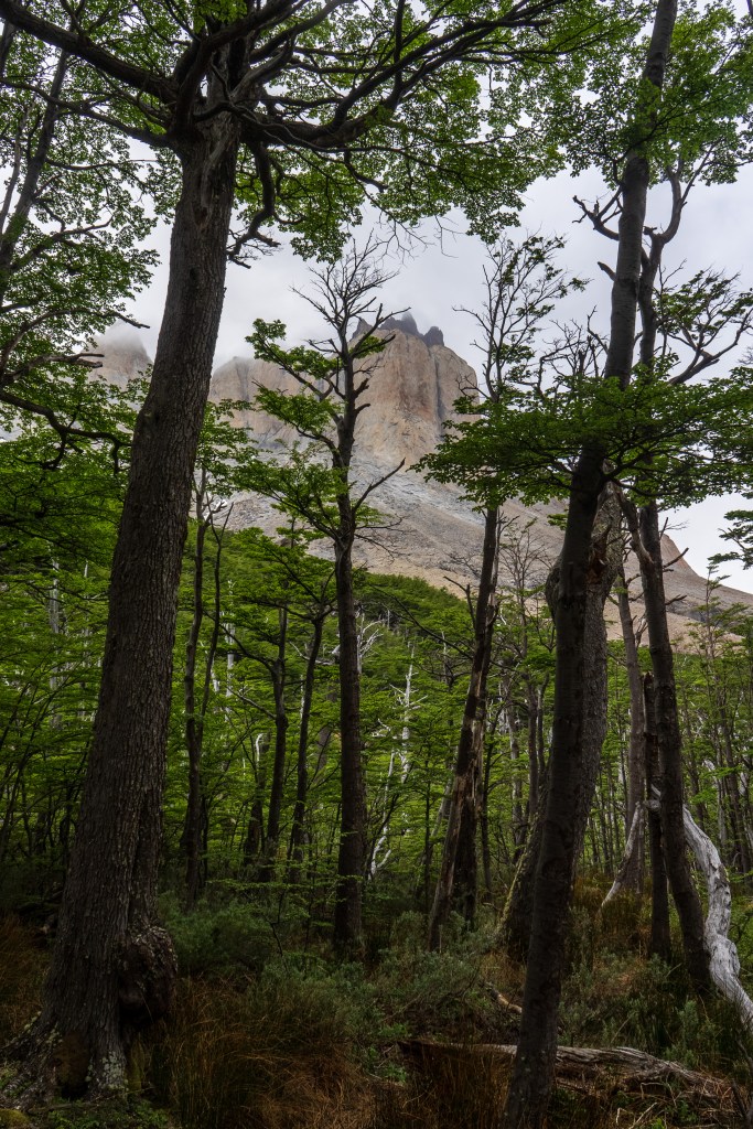 My third day was with a full pack, past the valley of the day before and alongside the southern lake. There was no extended climb but lots of up and down as I crossed the forest out onto the exposed eastern reaches. The path got narrow and the sun beat down all day. At one point I froze mid-stride as I saw a humeul, an endangered deer, looking out over the lake before trotting off into the forest. About half-way though the day the path dropped down to a beach of black and white pebbles leading into the clear blue lake. Without a moment’s hesitation I dropped my pack and walked into the water. It was ice cold and I lasted not even a minute before scrambling back to the beach and drying off in the sun, leaning against a log and making some lunch. The rest of the day was a sweaty slog through the dust with aching shoulders before reaching the final ridge where the land opened up and I could see the campsite in the distance. I pitched my tent under the shade of a tree and spent the evening with friends from the boat and planned the next day’s hike to the towers.
