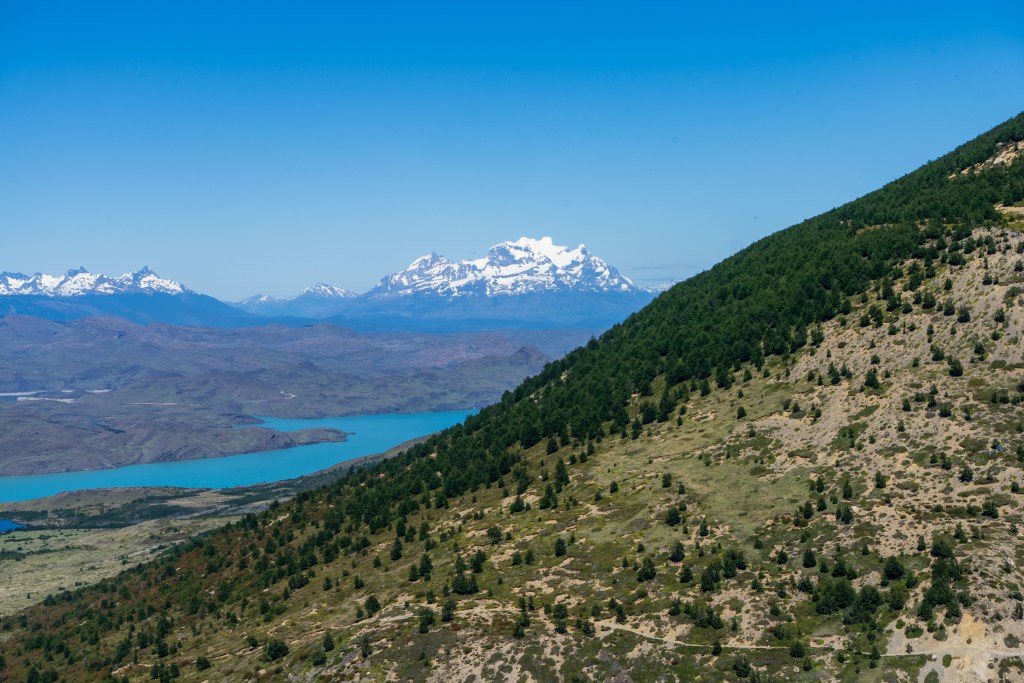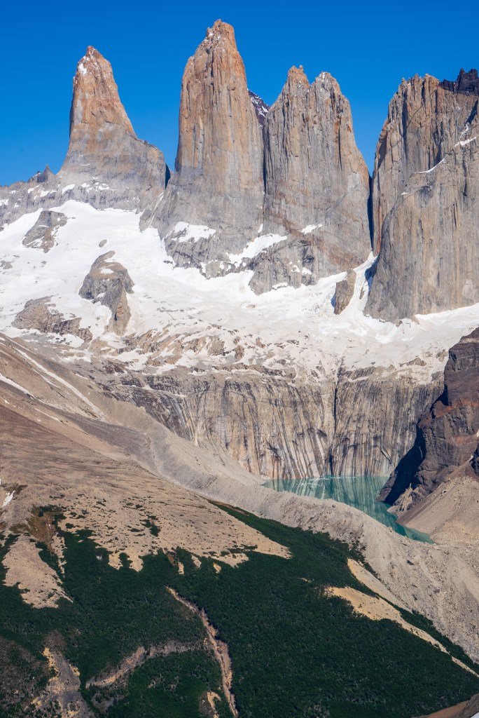 The central valley was green, untouched by the fire, and climbed steeply alongside a river fed by snow melting down the opposite face. Smaller ice fields hung steeply on ledges and fed snowdrifts below, the occasional avalanche sending impossibly loud echos down the valley. Through a dense forest where pumas are known to roam, one hiker I met actually had a video of one crossing the path, the trail opened up below the back of the towers. The final few hundred metres were a steep scramble to a view point where I rested a the top of the trail, the valley still climbed up towards the distant wall where the river began. The return journey gave a spectacular view out over the lakes towards the plaines in the south.